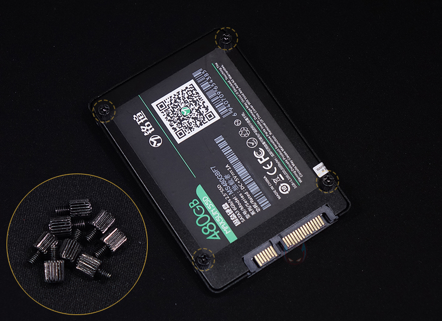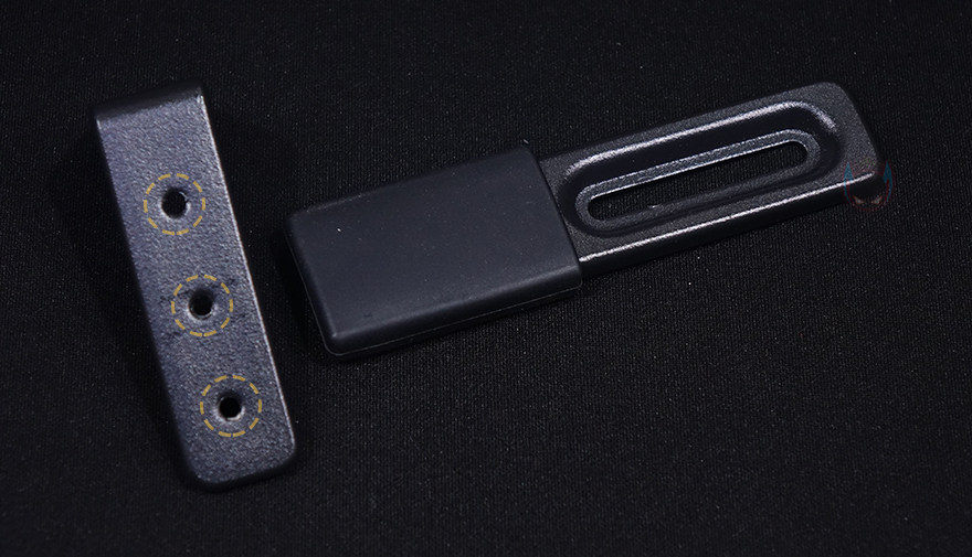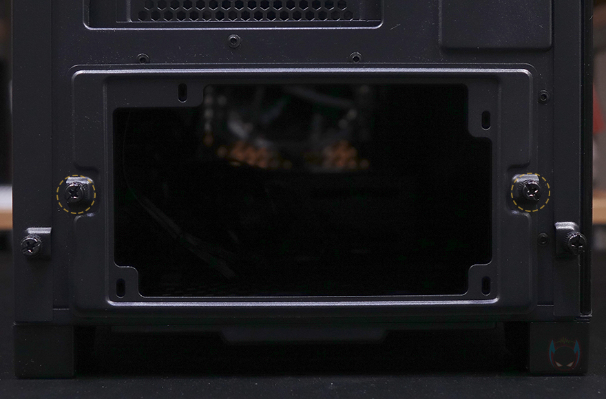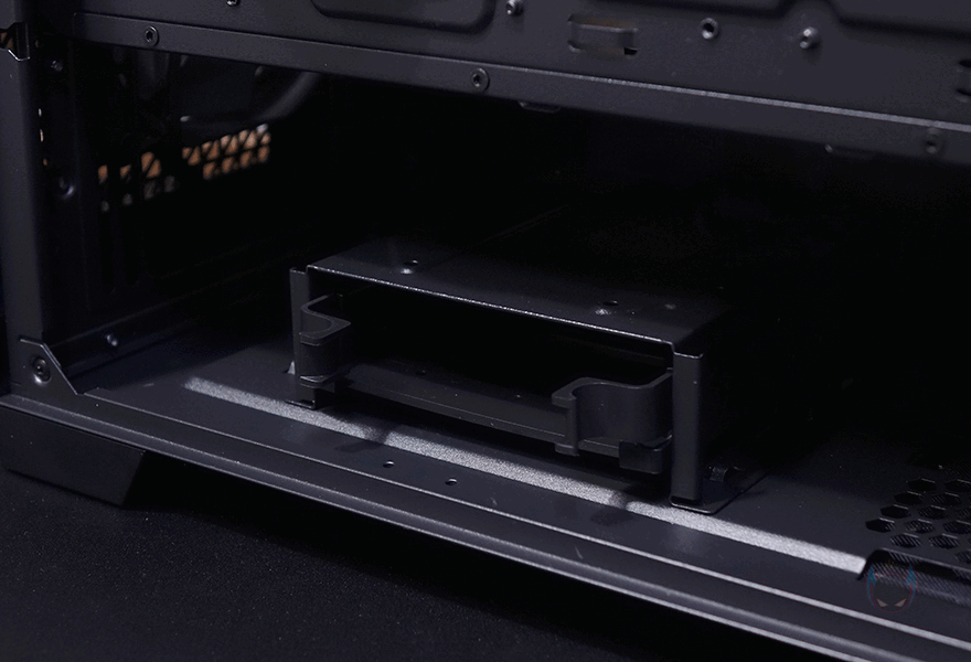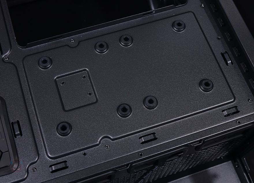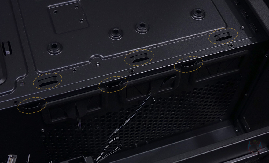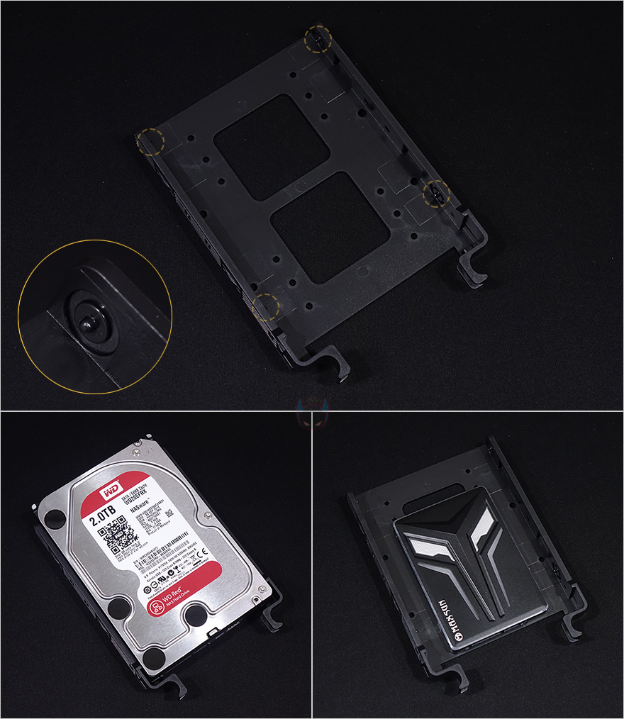 메인보드 트레이를 후면에서 보면, 큼지막한 CPU-cut-out을 비롯해 윗부분에 케이블을 정리할 수 있는 홀과 앞부분에 기본 케이스 패널의 케이블을 벨크로타이로 정리해 놨으며, 주변으로도 케이블 정리를 할 수 있게 홀 처리와 함께 고무 패킹도 적용하고 있습니다. 또한, CPU-cut-out 바로 아래에는 2.5인치 저장장치를 장착할 수 있는데, 제공되는 전용 볼트를 저장장치에 체결한 후 그대로 장착 자리에 끼워주면 됩니다. 장착 자리에 각 홀마다 고무 패킹이 있어서 잘 빠지지 않고, 매우 간단하게 장착할 수 있어서 편리하죠. 또한, 바로 아래에는 역시 케이블을 정리할 수 있게 묶을 수 있는 고리를 적용하고 있습니다.