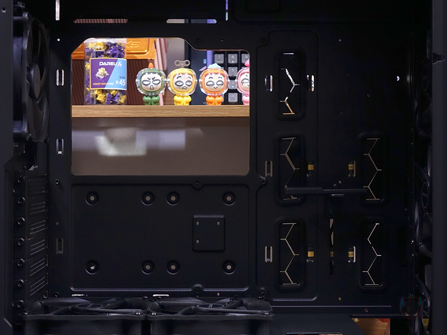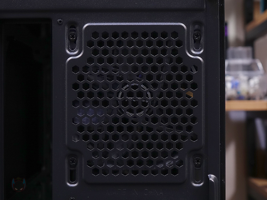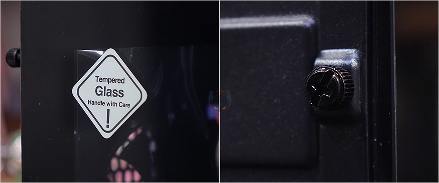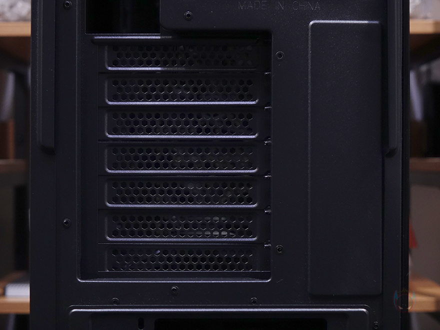 P20C ELITE 6FAN PC케이스의 사이드 패널은 전면시 오른쪽은 일반 샤시로 민무늬로 처리했으며, 왼쪽 패널은 앞서 언급한 대로 강화유리가 적용되었는데, 바깥쪽과 안쪽 모두 개봉 시 보호비닐이 부착되어 있으며, 꽤 깔끔하게 붙어있기 때문에 굳이 뗄 필요까지는 없어서 사용자가 선택하면 되겠습니다. 물론, 양쪽 패널 모두 고정은 후면 핸드-스크류를 사용했습니다. 또한, 케이스 후면에는 배기역할의 에어홀 처리와 함께 내부에 120mm 팬이 기본 장착된 것을 간접적으로 확인할 수 있으며, PCI슬롯은 미들타워 기준인 7개를 갖추고 있고, 맨 아래는 파워서플라이 자리로 후면에서 손쉽게 장착/분리할 수 있게 가이드 브라켓을 적용하고 있는데, 역시 핸드스크류 사용으로 쉽게 분리됩니다. 참고로 뒤에서 다시 확인하겠지만, 후면 120mm 팬은 원래 P20C/P20CE ELITE 기본 모델에는 포함되어있지 않습니다. 6FAN 모델에만 적용된 거죠.