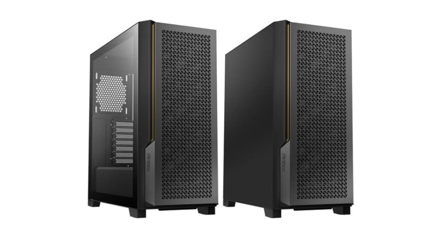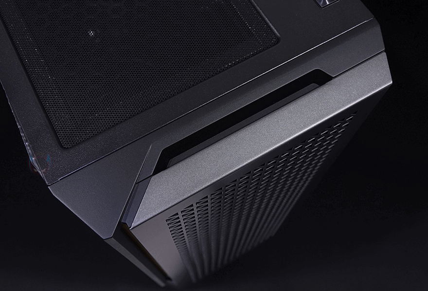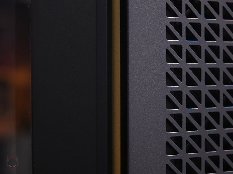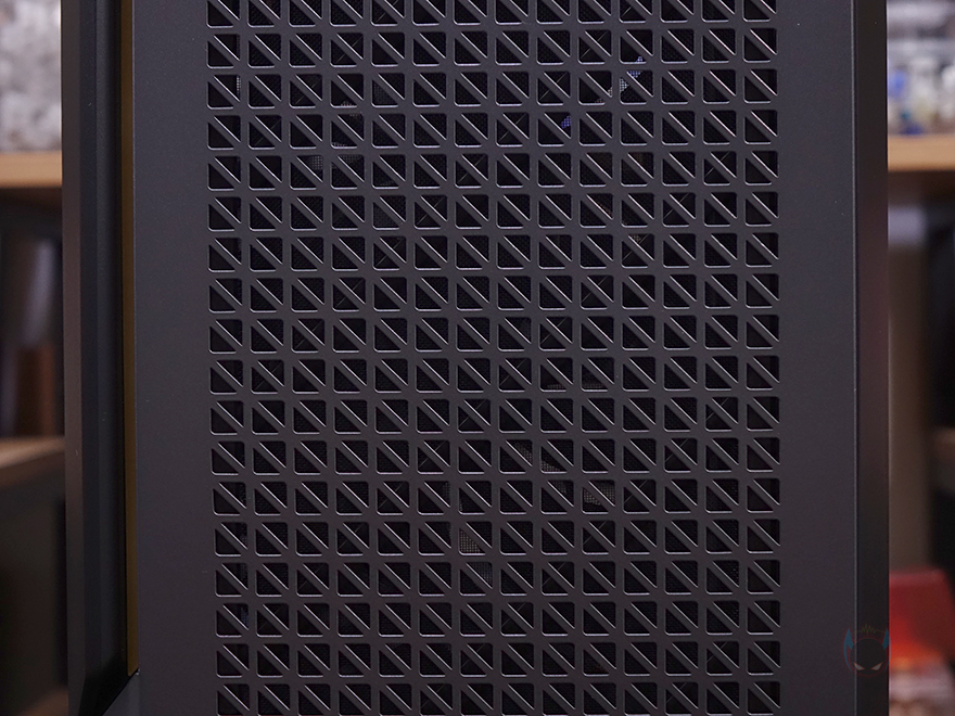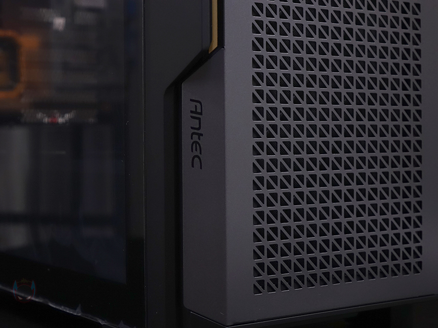 본격적으로 안텍 P20C ELITE 6FAN PC케이스를 살펴보는데, 외형부터 살펴보면 일단 색상은 블랙계열이고, 시작에서 언급했듯이 P20C ELITE는 전면시 왼쪽 측면 사이드 패널이 강화유리이고, P20CE ELITE는 일반 샤시 패널로 적용되어 있습니다. 그리고, 국내에서 판매되는 제품명에는 메탈 메쉬(Metal Mesh)라는 명칭이 붙는데, 바로 전면 패널을 의미하죠. 전면 패널은 메탈 소재에 일정 패턴의 디자인으로 에어홀 즉 메쉬 디자인을 적용하고 있습니다. 그리고, 왼쪽으로는 구분선 디자인을 적용하면서 안쪽으로 골드색상의 라인 디자인을 적용하고 있고, 그대로 아래쪽에는 제조사 로고를 새겨놨죠. 일반적으로 전면 패널을 좌우 대칭으로 하는 경우가 많은데, 이 P20C/P20CE ELITE는 나름 비대칭으로 차별성을 주고 있습니다.