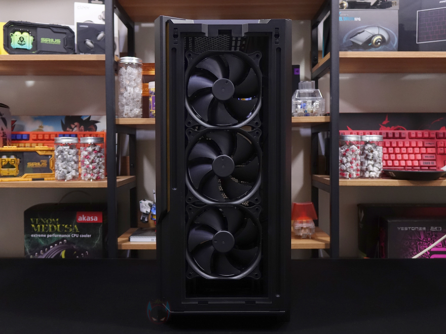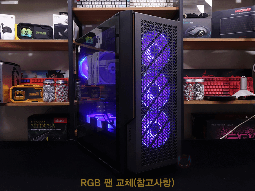 끝으로 조립 후 P20C ELITE 6FAN PC케이스 전원을 켜면 기본 제공되는 6개의 팬이 작동되는 것을 확인할 수 있는데, 앞서 확인했듯이 기본 제공되는 팬들이 모두 PWM 방식이라 내부 온도에 따라 자동 속도조절된다라는 장점이 있지만, 소비자 선호에 따라선 기본 제공 팬들이 모두 Non-RGB 팬이라 아쉬워할 수 있습니다. 리뷰에서도 이부분을 감안해 마지막 참고사항으로 직접 RGB 팬으로 교체해봤는데, 전면 메쉬 디자인과 측면 강화유리가 있어서 시각적인 효과가 잘 표현되는 것을 확인할 수 있어서, RGB 팬으로 교체하고 싶은 소비자들은 충분히 교체해서 시스템을 꾸미는 것도 좋을 것 같습니다.