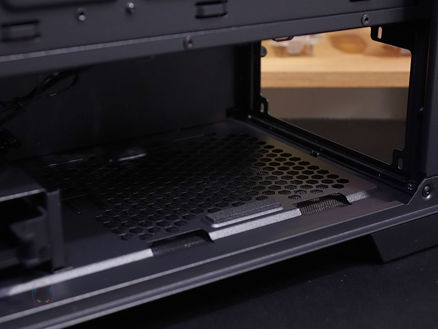 외형 끝으로, 케이스 밑바닥을 살펴보면 앞뒤로 약 21.5mm 높이의 받침대가 적용되어 있으며, 진동소음 최소화를 위해 고무패드도 기본 부착되어 있죠. 또한, 내부에서 확인하겠지만, 앞자리에는 내부 HDD 베이를 위치 이동할 수 있게 처리되어 있으며, 뒤쪽 파워서플라이 자리에는 분리형 먼지필터가 적용되어 있는데, 필터를 분리하면 역시 파워서플라이 쿨링효과를 위해 에어홀이 처리된 것을 확인할 수 있죠.