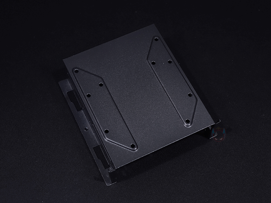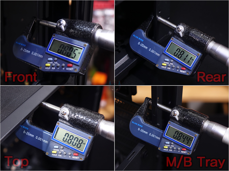 내부 하단에는 앞서 외부에서 잠깐 확인한 대로, 뒤쪽에는 파워서플라이 자리로 받침대는 물론이고 진동소음을 잡아주기 위해 패드도 부착되어 있습니다. 그리고, 앞쪽에는 HDD 전용베이가 적용되어 있는데, 슬라이드 방식의 가이드 1개를 적용하고 있죠. 가이드에는 기본 3.5인치 HDD 장착을 무나사 방식으로 장착할 수 있게 걸쇠방식으로 적용했으며, 2.5인치 저장장치도 나사방식으로 장착할 수 있게 겸용으로 갖추고 있습니다. 또한, 앞서 외부에서 언급했듯이 베이도 분리가 가능해 위치 이동이 가능하고, 베이 상단에도 추가로 3.5인치 또는 2.5인치 저장장치를 장착할 수 있게 지원해주고 있습니다. 끝으로, P20C ELITE PC케이스에 사용된 샤시의 두께를 부위별로 측정한 결과, 약 0.8mm대로 미들타워 제품으로써는 꽤 두꺼운 샤시를 사용했다라는 걸 알 수 있습니다.