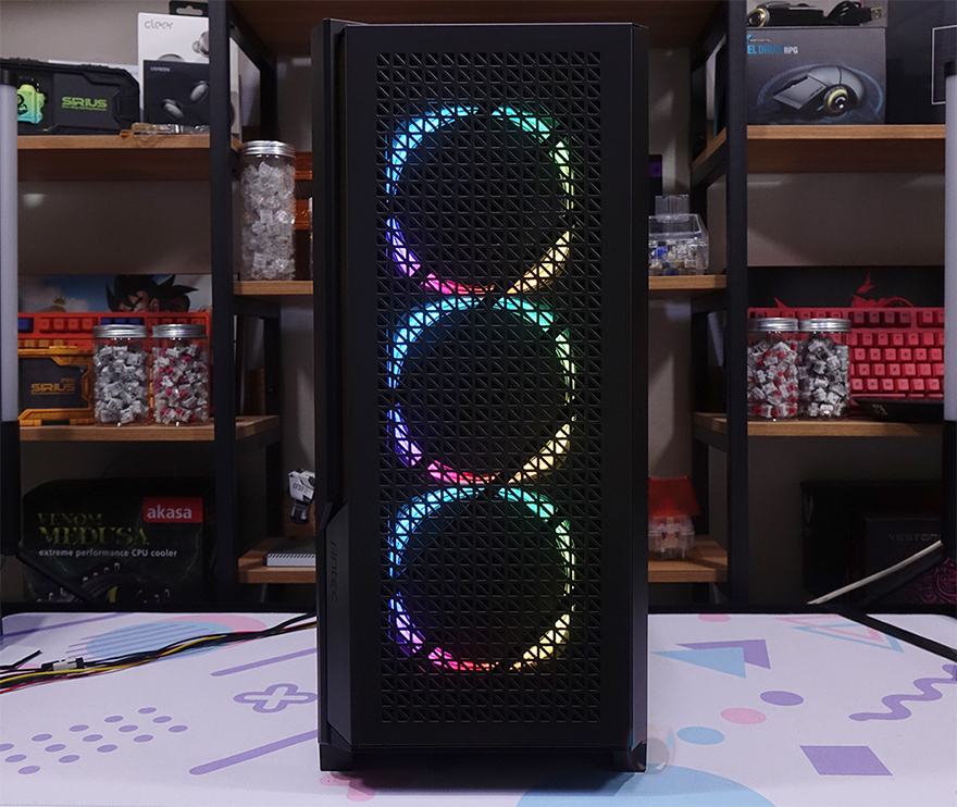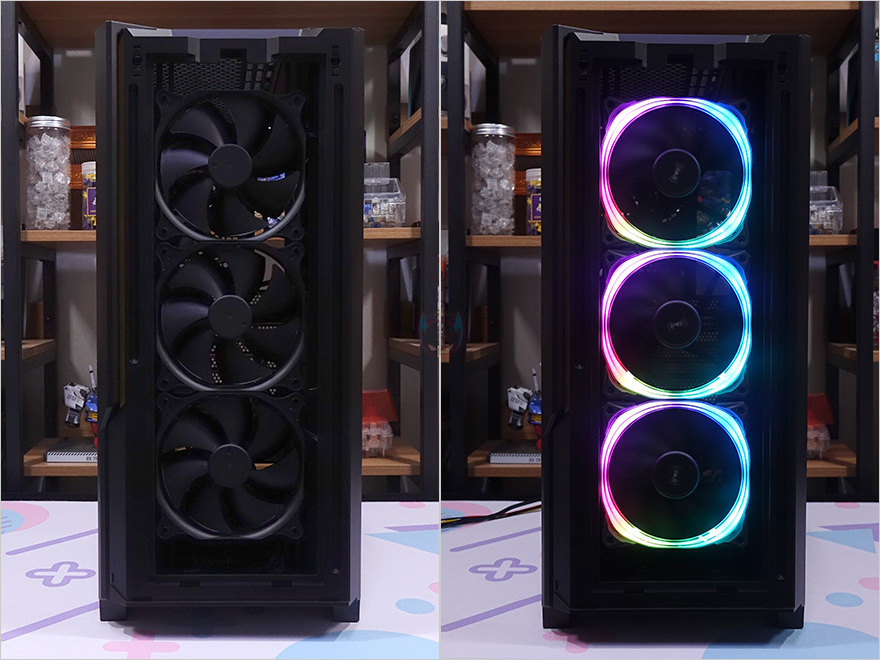그리고, 시작에서 언급했듯이 고급형 PC케이스에선 오히려 RGB LED 팬 제공이 적거나 없는 편입니다. 그래서, 사용자가 직접 쿨링시스템을 꾸미는 경우가 많은데, 앞서 만난 안텍 P20C ELITE 케이스 역시 팬 제공은 해주지만, LED 팬이 아니죠. 그래서, Fusion 120 ARGB 케이스 팬으로 교체를 해봤는데, 확실히 시각적인 감성이 살아납니다. 물론, 메쉬 디자인 그릴을 장착해도 조명 효과는 충분히 전달이 되죠. 또한, Fusion 120 ARGB 케이스 팬이 각 메인보드 제조사의 RGB Sync와도 연동이 가능하기 때문에 RGB 조명 시스템을 꾸미는데도 제격입니다. 또한, 제품 박스에 표기된 제조사 외에도 메인보드에 5V ARGB 헤더와 프로그램이 제공되는 메인보드라면 대부분 호환이 됩니다. 실제로 ASUS/기가바이트/MSI/ASRock 외에 메인보드에서 RGB Sync가 연동되는 것을 확인할 수 있었죠.
