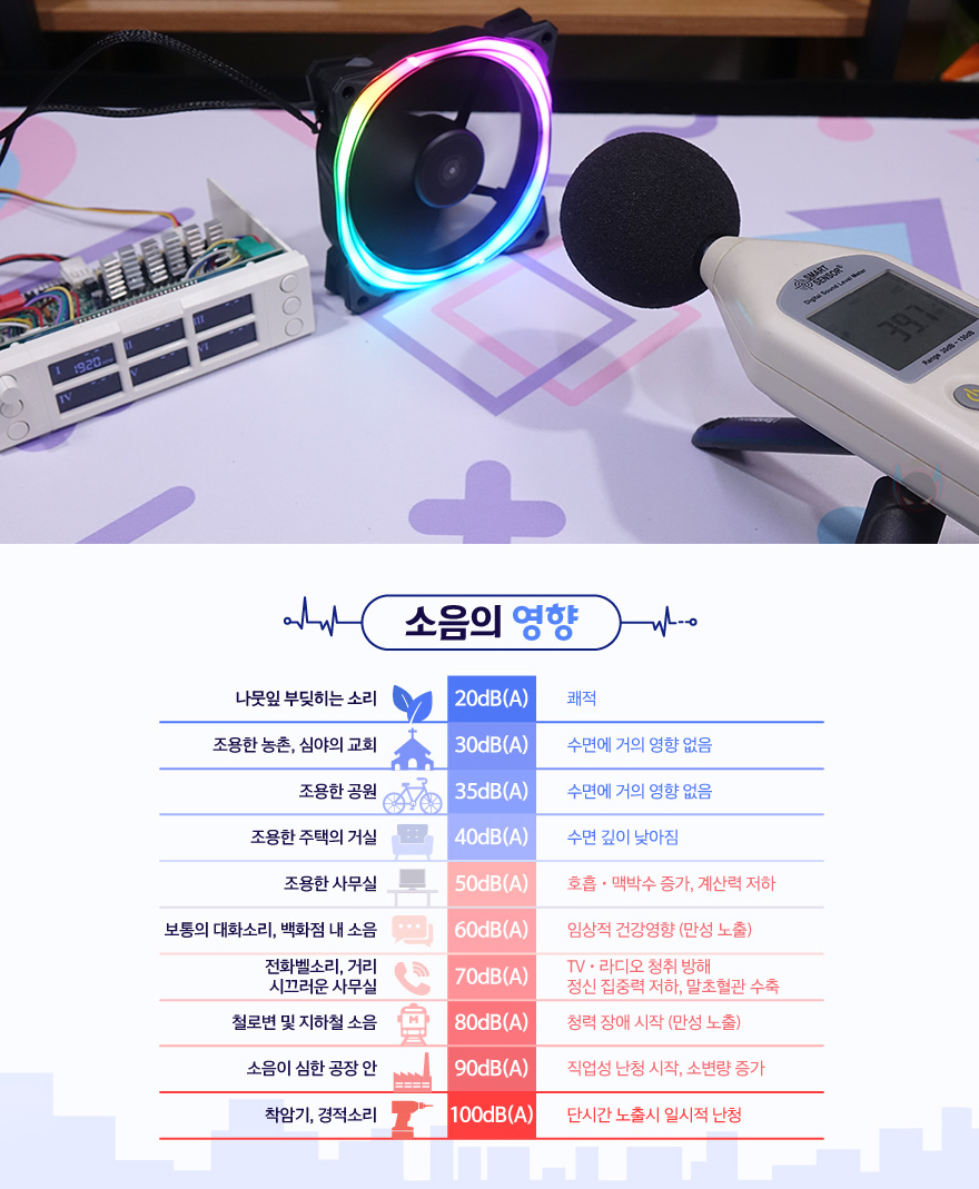끝으로, 안텍 Fusion 120 ARGB 케이스 팬은 기본 사양표기에서도 언급했듯이, 최대 속도 2000 RPM을 지원합니다. 일반적으로 보급형 RGB LED 팬 제품들이 1500RPM을 지원하는 경우가 많고, 고급형은 1800RPM 또는 2000RPM을 지원하죠. 그래서, Fusion 120 ARGB 케이스 팬도 고급형에 속한다 할 수 있는데, 최대 속도일 때 소음 측정을 해보면, 약 40dB(A) 수준으로 높은 RPM 속도임에도 조용한 편입니다. 물론, 실제 PC케이스에 장착해서 사용한다면 내부에 장착된다라는 점과 거리감도 더 있기 때문에 소음은 더 작게 들리죠. 따라서, 소음에 대해선 크게 우려할 필요가 없겠습니다.