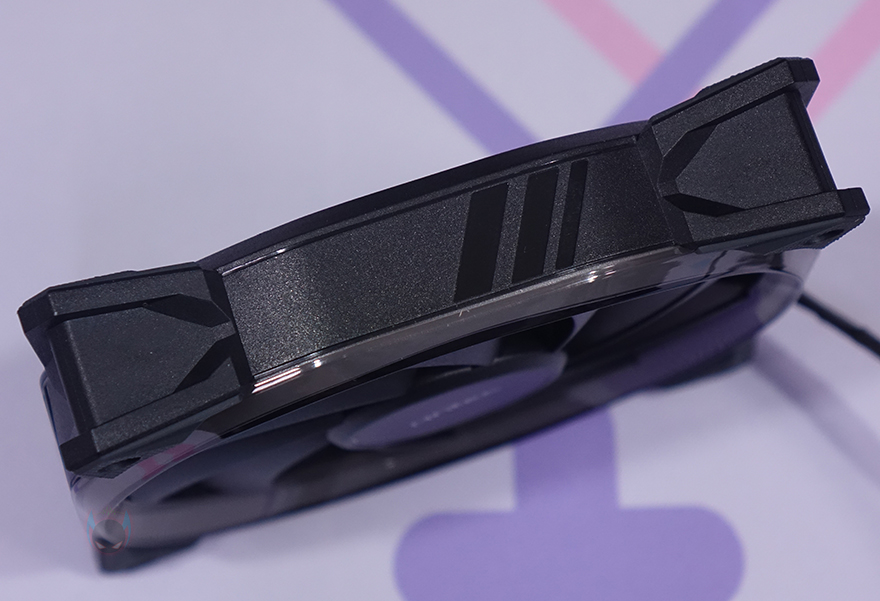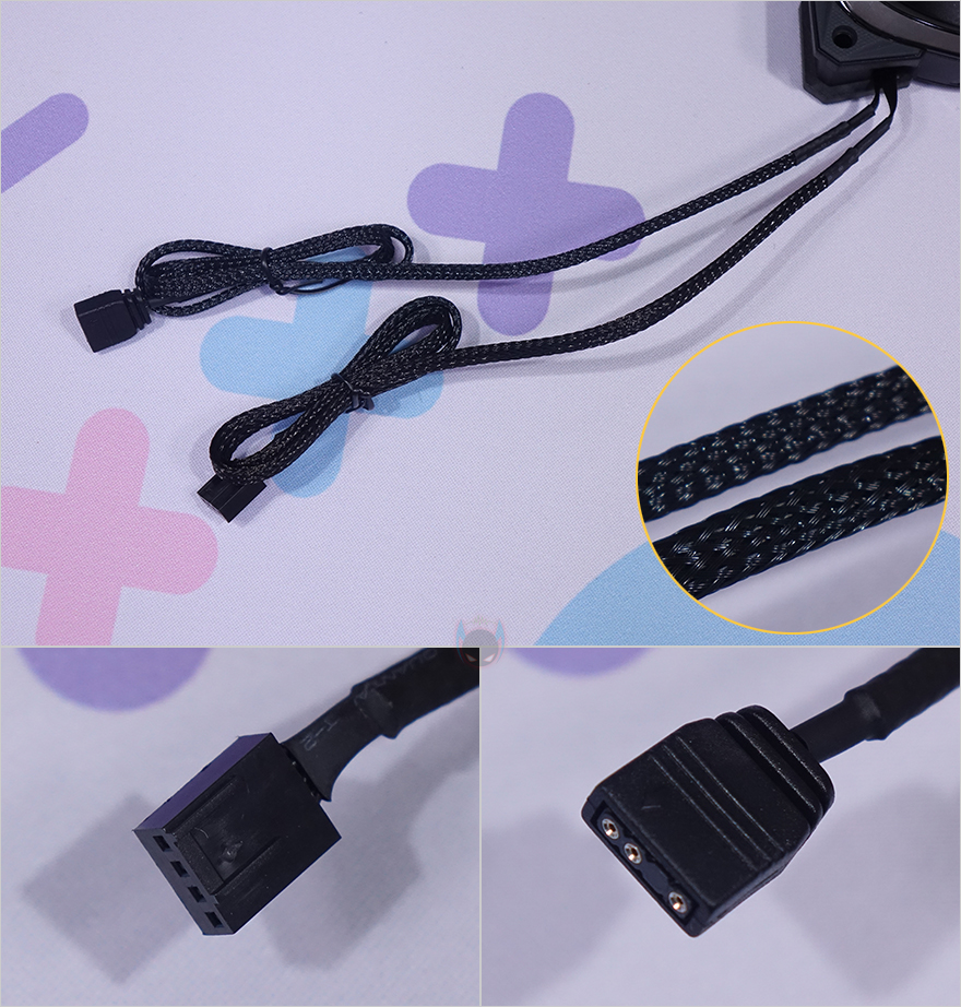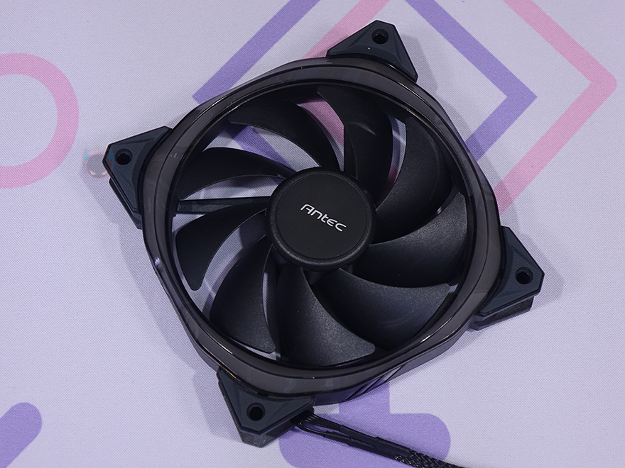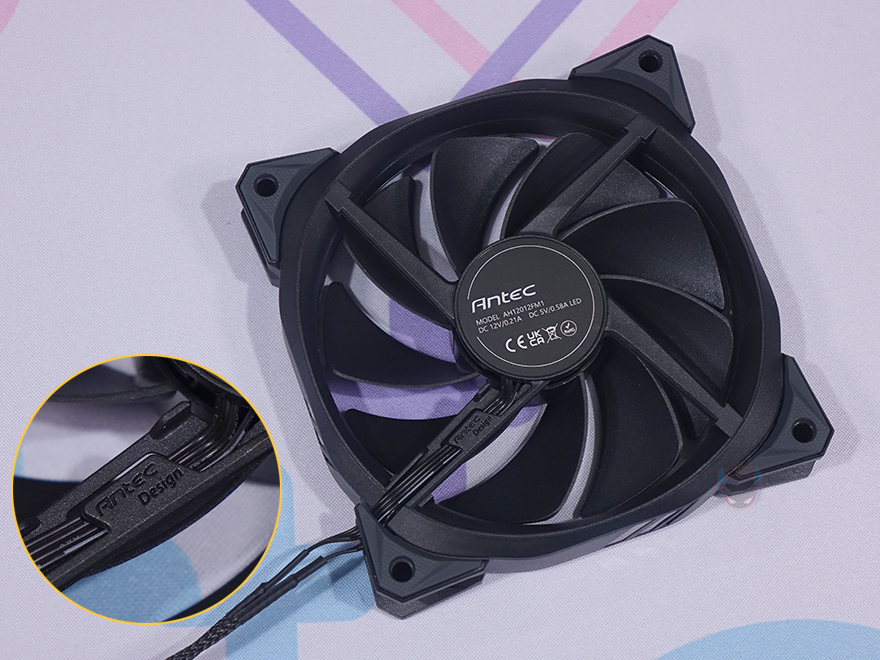 또한, 각 모서리 부근의 나사-홀 위치에는 진동소음을 줄이도록 방진패드가 적용되어 있는데, 일반적인 평면이 아니라 홀에 가까워질수록 더 두꺼워지는 형태로 나름 신경써서 디자인을 적용했습니다. 그리고, 이런 신경 쓴 디자인은 프레임 측면에서도 확인할 수 있으며, 팬 후면 노이즈를 감소시키는 프레임 부분에도 한쪽에 'Antec Design'이라고 새겨놨죠. 뿐만 아니라 팬 케이블 역시 전원 케이블과 LED 케이블 2개 모두 전체 슬리빙 처리를 해놨으며, 팬 연결은 PWM 4pin 방식이고, LED는 앞서 언급했듯이 5V ARGB 3pin 방식입니다. 참고로 케이블 길이는 모두 50cm입니다.