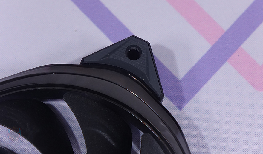 앞서 제품 박스에서 주요 특징 표기를 확인했듯이, Fusion 120 ARGB 케이스 팬의 가장 큰 특징 중 하나는 바로 디자인부분으로 흔히 말하는 테두리 프레임이 RGB LED 조명효과를 보여주는 부분으로 일반적인 단조로운 링(Ring) 디자인이 아니라 크리스탈 윤곽의 감성을 느끼게 해주는 링 디자인으로 안쪽에 반투명과 바깥쪽에 투명으로 이중 레이어 구조를 가지고 있습니다. 그리고, LED는 RGB LED로 주소지정의 5V ARGB 방식으로 총 16개가 내장되어 있죠.