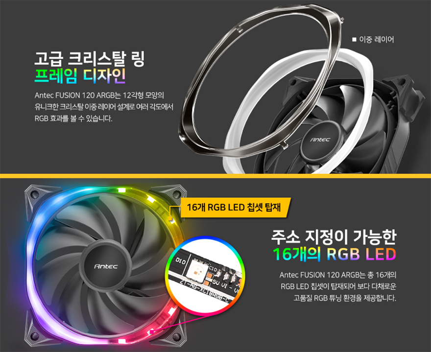 이제는 조립 PC를 구상할 때 RGB 조명효과에 대한 배제를 할 수 없죠. 거의 모든 PC부품들이 RGB 조명을 갖추고 있기 때문입니다. 특히, 요즘 출시하는 대부분의 PC케이스들은 기본적으로 RGB 케이스 팬을 제공하는 경우가 많은데, 고급형보다는 저가형 제품에서 많이 볼 수 있습니다. 물론, 저가형 제품에 기본 제공되는 RGB 케이스 팬들은 3 핀이거나 호환성이 안 되는 팬을 제공합니다. 이렇다 보니 직접 쿨링 시스템을 꾸미고 싶은 소비자들은 당연히 고급형 PC케이스를 선택하고, RGB 케이스 팬도 따로 취향에 맞는 걸로 고르는데, 안텍(Antec) 역시 이런 소비자들이 선택할 수 있는 RGB 케이스 팬 제품들이 있습니다. Prizm 시리즈와 Fusion 시리즈죠. 둘 중 단연 고급형은 Fusion 모델입니다. 그래서, 이번 시간에는 안텍의 고급형 RGB 케이스 팬 Fusion 120 ARGB를 한 번 살펴보도록 하겠습니다. 그럼,