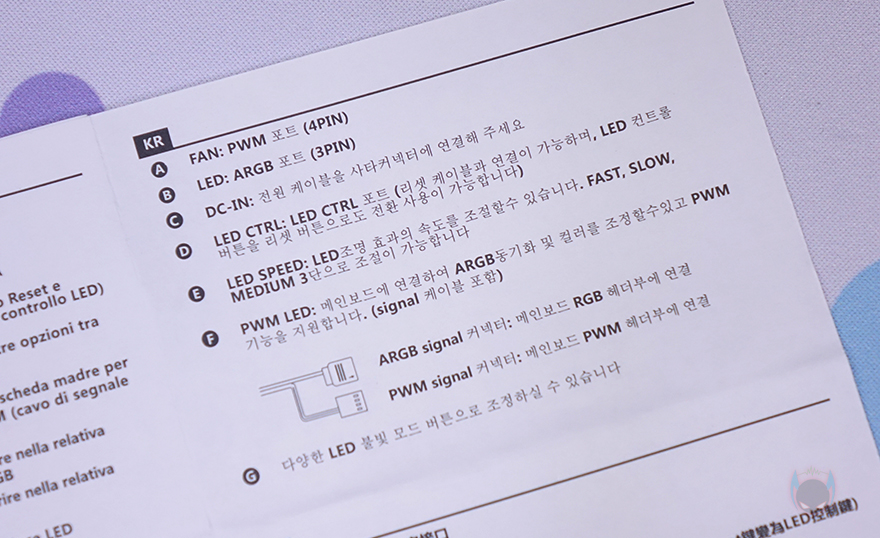 Fusion 120 ARGB 케이스 팬 3Pack 제품의 박스를 열어보면, 팬과 컨트롤 박스 모두 개별 박스 포장으로 한 번 더 적용되어 있습니다. 3Pack 제품 같은 경우 제품구성은 Fusion 120 ARGB 케이스 팬 3개, 나사, 컨트롤 박스, 컨트롤 박스 부착을 위한 벨크로타이, 컨트롤 박스 케이블들, 제품설명서로 이루어져 있죠. 물론, 제품 설명서에는 한국어도 포함되어 있습니다.