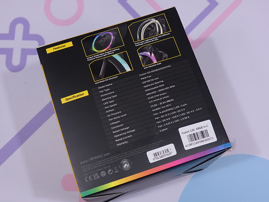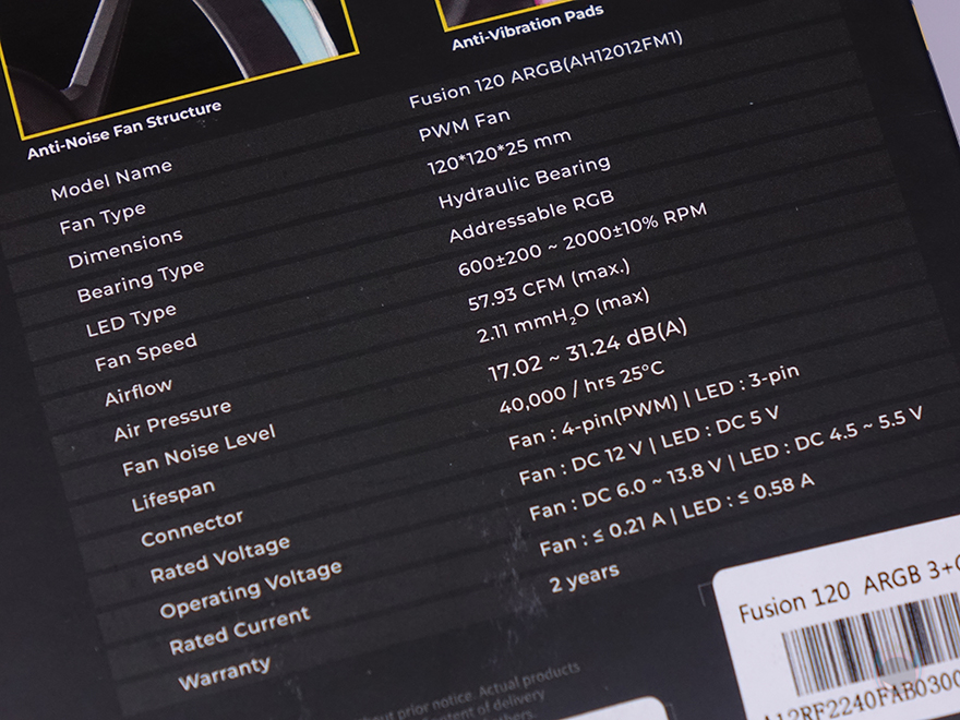 박스 후면에는 제품 주요 특징으로 LED 부분과 디자인부분을 언급하고 있으며, 아래에는 기본 사양 표기로 팬 크기부터 베어링, 속도, 풍량, 수명, 연결 방식 등 상세하게 표기하고 있습니다. 특히, 케이스 팬 제품임에도 2년 무상보증기간을 지원해주고 있는 게 눈에 띄는데, 국내에도 정식수입사인 (주)뉴런글로벌을 통해 지원되고 있죠. 또한, ARGB 팬임에도 최대 속도 2000 RPM까지 갖추고 있다라는 점도 눈에 띕니다.