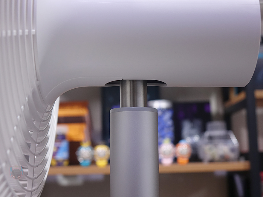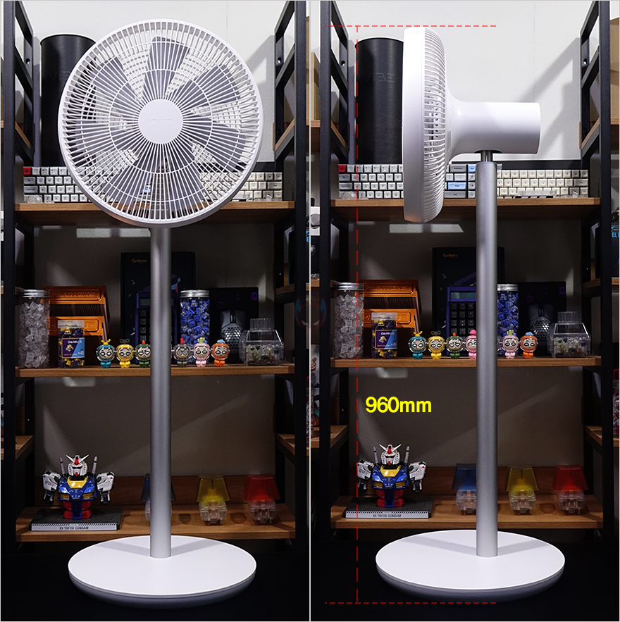 그럼, 조립된 스마트미 2S 무선 선풍기를 살펴보는데, 높이는 선풍기 팬 수평 기준으로 받침대부터 팬 맨 윗부분까지 960mm 길이를 가지고 있습니다. 그리고, 팬 지름도 앞서 확인한 아래 받침대와 동일하게 330mm 크기를 가지고 있죠. 팬 커버 전면에는 심플하게 로고(Logo)만 새겨져 있으며, 선풍기 후면 그러니깐 모터쪽에는 후면에는 좌우 회전 버튼이 배치되어 있고, 모터 상단에는 전원 버튼과 작동과 충전 상태를 확인할 수 있는 LED 인디케이터가 배치되어 있습니다. 그리고, 스탠드는 알루미늄 소재로 지름 40mm에 길이 약 692mm를 가졌으며, 모터와 스탠드 연결부는 회전과 상하 각도조절이 되는 부분으로 상하 각도조절은 수평 기준에서 위로 25˚, 아래로 15˚로 총 40˚ 범위를 가지고 있습니다.