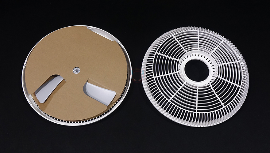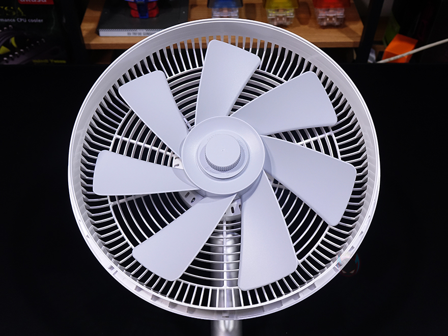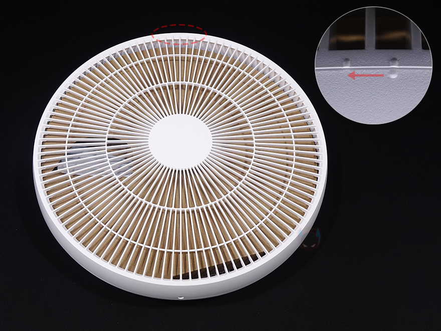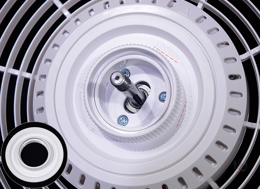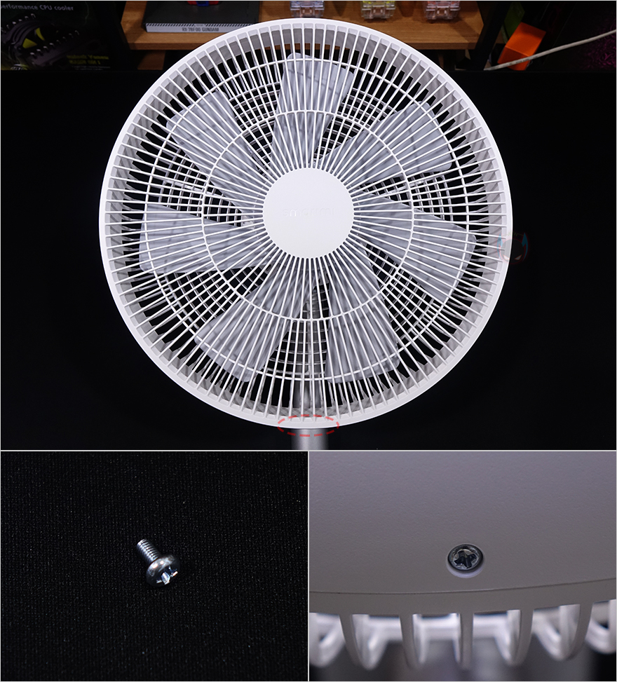 이제 팬 커버 내부에 팬 날개를 장착해줘야하는데, 일단 커버 윗부분에 표시된 분리향으로 커버를 돌리면 쉽게 앞뒤가 분해가 됩니다. 그러면, 내부에 장착되지 않은 팬 날개의 포장 종이까지 벗기면 총 3개 구성인데, 먼저 팬 커버의 뒷면을 모터 방향에 맞춰서 끼운 후, 팬 커버 고정 노브로 체결해 줍니다. 그리고, 팬 날개를 역시 모터 회전축과 홈에 맞춰서 끼운 후, 팬 날개 고정 노브로 체결해 주고, 최종적으로 팬 커버 앞면을 다시 끼운 후, 커버 아래쪽에 고정 나사로 잠그면 모든 조립이 마무리됩니다. 일반적인 선풍기 조립과 다르지 않아서 큰 어려움은 없습니다.