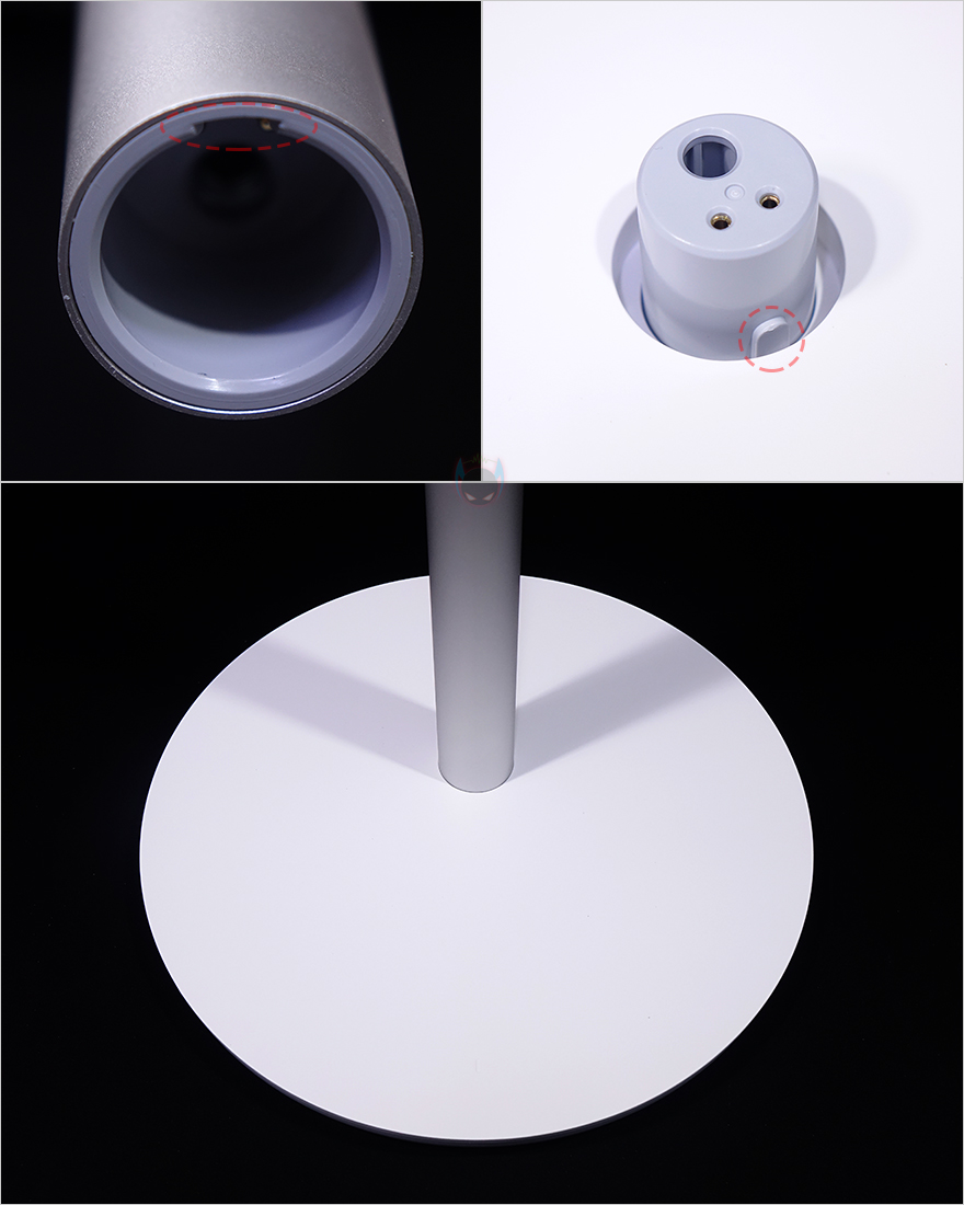 사용 전에 조리부터 해야겠죠. 일단 받침대 역할을 하는 베이스는 원형 디자인으로 지름 330mm를 가지고 있으며, 밑바닥에는 미끄럼방지 고무 패드가 5개 부착되어 있습니다. 그리고, 후면방향에는 전원 케이블과 연결되는 DC 포트가 있죠. 베이스에는 모터&스탠드를 결합해줘야 하는데, 모터&스탠드 봉의 구멍과 베이스의 홈 방향을 맞춰서 끼워주고, 제공해 주는 렌치와 육각 볼트로 고정시켜 주면 됩니다. 초보자도 쉽게 조립할 수 있는 만큼 큰 어려움이 없습니다.