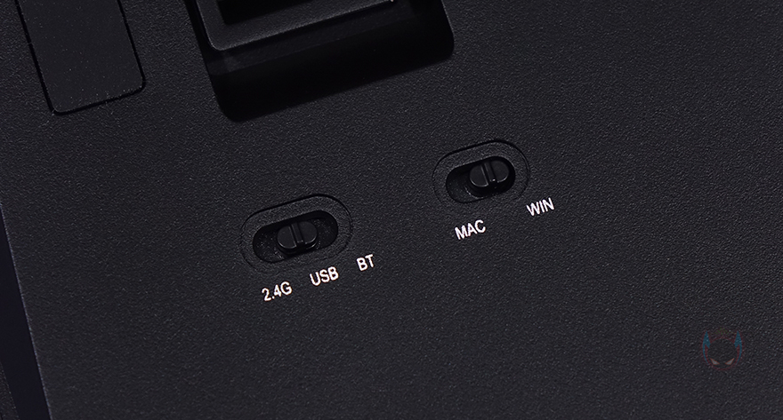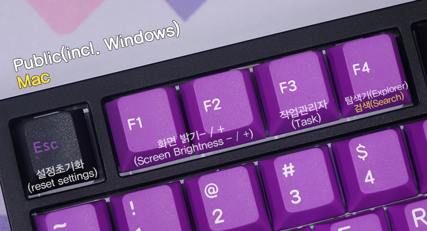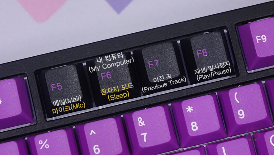 이 외에도 숫자키 1~5 키까지는 디바이스 연결 선택으로 1~3 키까지는 블루투스(BT), 4 키는 무선 2.4GHz, 5키는 유선 모드죠. 그리고, Z/X/C키는 레이아웃 선택을 할 수 있으며, 윈도우키는 당연히 잠금/해제 할 수 있고, B키는 배터리 잔량, 스페이스-바는 선택한 모드와 레이아웃 상태를 확인할 수 있게 해줍니다. 이 밖에 U/I/O 키는 역시 담기 못한 나머지 특수키들 PrtSc, Scroll Lock, Pause 키로 사용되며, ESC키는 설정초기화 기능을 가지고 있죠. 부가기능 끝으로, F숫자키들은 F4~F6키를 제외하고는 모두 윈도우와 맥(Mac) 공용 기능으로 사용되는데, F1~F2키는 화면밝기조절, F3키는 작업관리자로 동일하며, F4키는 윈도우 환경에선 탐색기, 맥에선 검색 기능이며, F5 역시 윈도우에선 메일, 맥에선 마이크, F6키는 윈도우에선 내 컴퓨터, 맥에선 잠자기 모드입니다. 그리고, F7~F9키까지는 재생컨트롤, F10~F12키까지느 음소거와 볼륨조절으로 동일하게 사용되죠. 그리고, F12키 옆에 배치된 Delete키는 Fn키 조합시 Insert키로 사용됩니다.