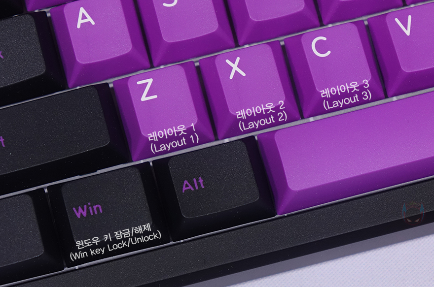 키-캡은 앞서 언급했듯이 제품 색상에 따라 블랙과 퍼플 투톤 컬러로 적용되었는데, 재질은 PBT 재질이고 이중사출 방식으로 처리했는데, 안쪽도 100% 채워진 상태라 키-캡 두께가 약 1.6mm로 두껍습니다. 참고로, 백라이트가 투과되지는 않습니다. 그리고, 앞서 구성품에서 확인했던 추가 교체용 검은색 스페이스-바로 교체해서 사용할 수 있고, 스테빌라이저는 체리식입니다.