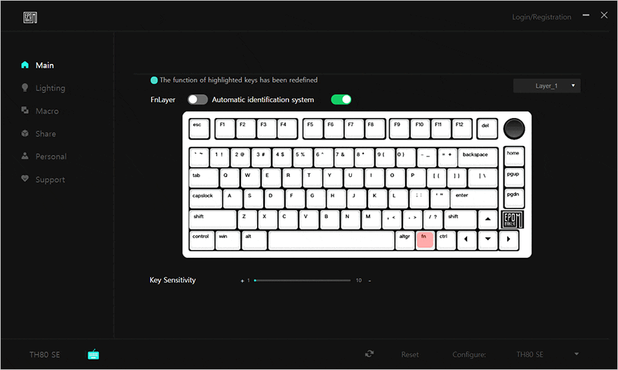 그리고, TH80 SE 키보드 역시 기존 TH80 series 제품들과 마찬가지로 전용 소프트웨어를 제공해주고 있는데, 기존보다 더 세심하게 설정할 수 있게 업그레이드되었습니다. 일단, EPOMAKER 홈페이지에서 다운로드해서 프로그램을 설치한 후 실행해 보면, 메인화면(Main)에선 인식된 키보드 인터페이스 화면에서 3개의 레이아웃 흔히 말하는 프로파일이 지원되고, 키 감도도 10단계로 조절할 수 있습니다. 그리고, FnLayer Off 상태에선 모든 키의 기능을 변경할 수 있고, On 상태가 되면 변경할 수 있는 키와 변경할 수 없는 키를 색상으로 구분시켜 주는데, 레드(Red) 색상은 변경이 불가능하고, 나머지 색상들은 변경이 가능합니다. 키 기능은 조합 키부터 매크로, 미디어, 마우스 기능으로 변경할 수 있죠. 그리고, 라이트닝(Lighting) 메뉴는 백라이즈 설정으로 앞서 18가지 모드 외에 추가로 음악(Musin) 모드 3가지를 프로그램에서 설정할 수 있습니다. 흔히 말하는 음악에 반응하는 리듬 모드죠. 또한, 모드 방향도 변경할 수 있습니다. 그리고, 무선 2.4GHz와 블루투스 사용 시 배터리 소모를 사용자가 설정할 수 있게 백라이트 Off 시간과 대기모드를 지원하는데, 백라이트 Off는 1분에서 최대 60분까지 설정이 가능하고, 항상 On상태도 가능합니다. 그리고, 대기모드는 10분에서 최대 60분까지 설정할 수 있죠. 이외에 매크로 지원과 매크로 설정을 공유(Share), 회원가입을 했을 시 EPOMAKER의 키보드 제품별로 설정값을 클라우드에 저장할 수 있고, 프로그램 업데이트나 키보드 펌웨어 지원도 기본적으로 갖추고 있습니다.