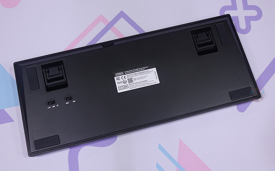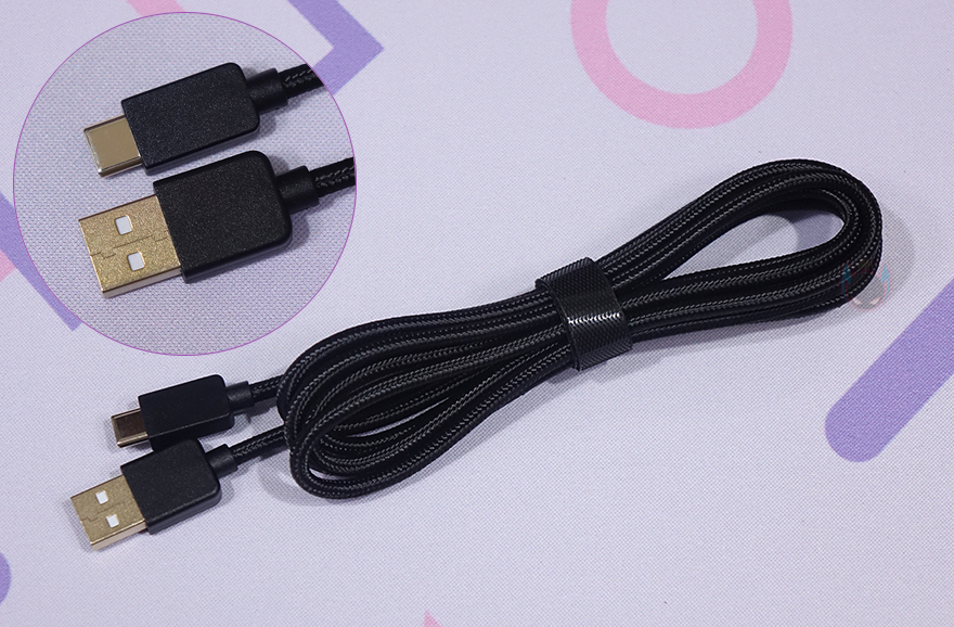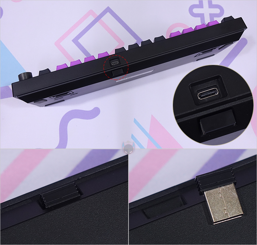 TH80 SE 키보드 전면에는 분리형 USB 전원 및 충전케이블과 연결되는 USB Type-C 포트가 배치되어 있으며, 바로 아래에는 무선 2.4GHz 연결 사용 시 이용되는 동글이(Dongle) 수신기가 수납되어 있습니다. 그리고, 키보드 밑바닥에는 미끄럼 방지 고무패드 부착과 함께 왼쪽 높낮이조절 받침대 아래에 무선 2.4GHz/유선/BT 모드 스위치, 맥(Mac)과 윈도우 모드 스위치가 배치되어 있습니다. 또한, 높낮이조절 받침대는 2단 조절로 측면에서 보면 타이핑에 최적화라 불리는 스텝-스컬처 2 단계배열을 추가로 확인할 수 있죠. 끝으로, 분리형 USB 전원 및 충전케이블은 총 1.8m 길이에 연결 인터페이스는 USB Type-C to A로 신호손실을 최소화하기 위해 금도금처리도 적용되었습니다.