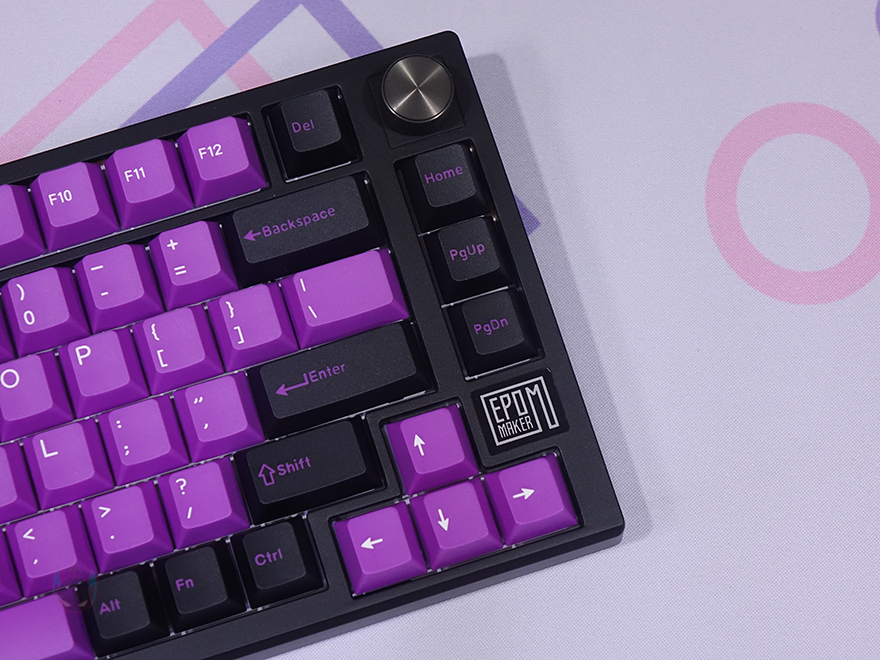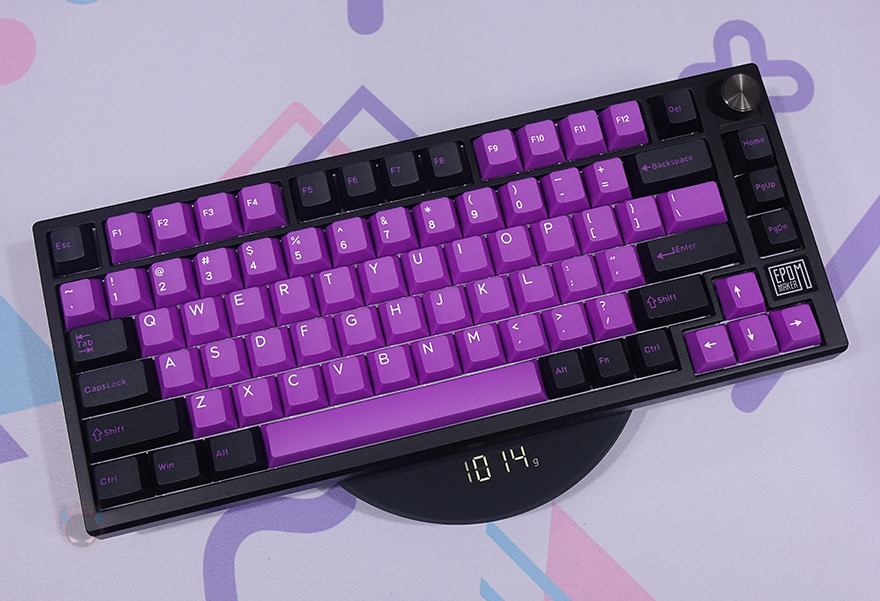 본격적으로 EPOMAKER TH80 SE 키보드를 살펴보면, 가장 먼저 눈에 띄는 점은 색상입니다. 기존의 TH80 series 제품들은 화이트&그레이(white&gray) 계열이었다면, 이번 TH80 SE는 블랙&퍼플(black&purple) 색상으로 적용되었죠. 물론, 약간의 배열 차이도 있습니다. 1개가 더 많죠. 앞서 시작에서 언급했듯이 SE가 스페셜에디션(special-edition) 약자라 문구처럼 기존 제품과는 색상부터 차별을 주고 있습니다. 그리고, 무게는 약 1kg으로 미니 키보드지만 꽤 묵직하죠. 그 이유는 이 제품 역시 가스켓 마운트(Gasket mount) 방식으로 내부에 이중 흡음재(EVA bottom foam, Silicone interlayer foam)와 스위치 패드(Poron foam switch pad)까지 적용되었기 때문입니다.