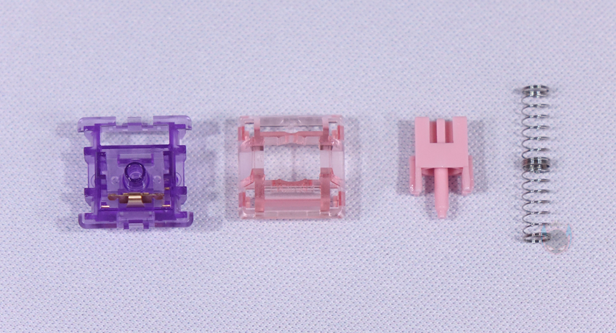 스위치는 TH80 SE 키보드에서 총 5가지 스위치 중 사용자가 선택할 수 있는데, 3가지는 EPOMAKER의 커스텀 스위치(custom switch)로 Flamingo/Budgerigar/Bluebird, 나머지 2개는 게이트론(Gateron)의 G Pro 스위치입니다. 리뷰에선 커스텀 스위치이자 리니어 타입인 Flamingo 스위치로, 상/하판 모두 반투명 컬러를 적용하고 있으며, 작동력(Actuation force) 47 ± 5gf, 초기 압력(Initial force) 35gf, 총 이동거리(Total Travel)는 3.80mm로 체리 기준의 적축 스위치보다 좀 더 가볍게 만들었습니다. 그래서, 스프링도 이중으로 적용되어 있죠. 물론, 스위치는 핫-스왑(Hot-swap) 방식이고 PCB기판에 구멍이 5개라 3pin과 5pin 스위치 모두 호환 사용이 가능합니다.