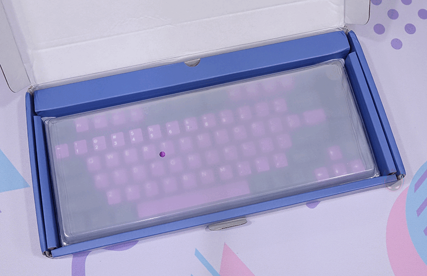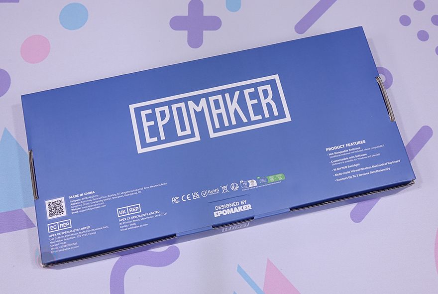 EPOMAKER의 키보드는 제품 박스가 심플한게 특징이죠. TH80 SE 역시 자사의 다른 제품들처럼 단색 배경 그러니깐 블루 색상 배경에 전면에는 해당 키보드의 윤곽 이미지와 모델명만 담고 있습니다. 측면에는 맨 오른쪽에 모델명 위에 스위치 표기를 해놨죠. 그리고 , 박스 후면에는 간단하게 중앙에 로고(Logo)와 오른쪽 아래에 제품의 주요 특징만 표기해놨습니다. 주요 특징으로는 핫-스왑 스위치(Hot-swap switch), 사용자정의 소프트웨어(Customizable with software), RGB 백라이트(RGB backlight), 유무선(wired/wireless) 지원, 3 디바이스(Devices) 연결 지원을 언급해 놨습니다.