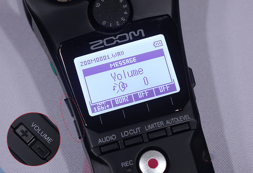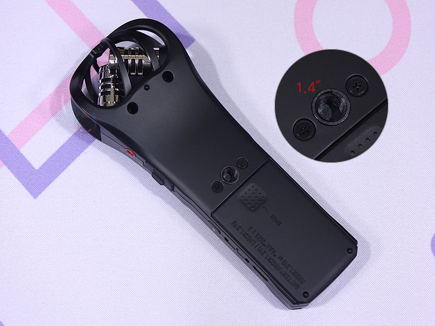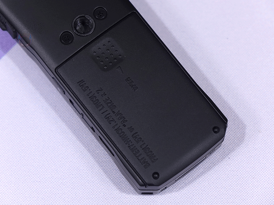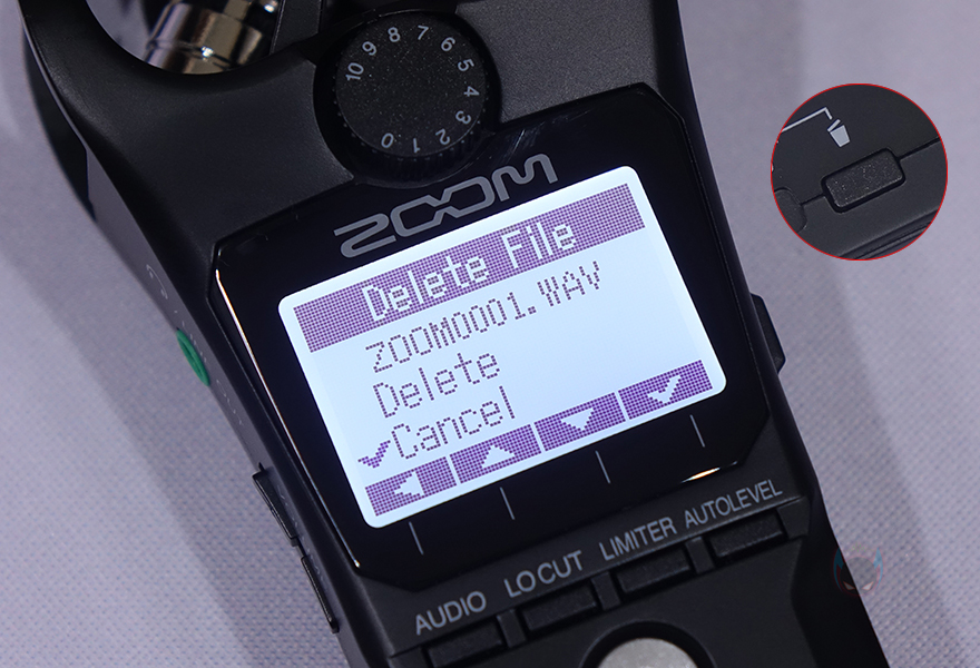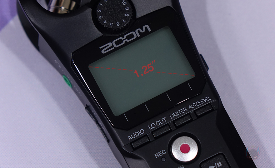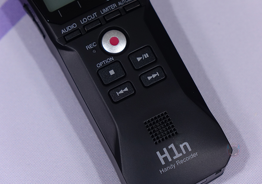 노브 아래에는 1.25인치 크기의 LCD가 적용되어 있으며, 그 아래에는 오디오(Audio)/로우컷(Locut)/리미터(Limiter)/자동레벨(Autolevel) 버튼이 배치되어있습니다. 그리고, 그 아래에는 녹음(REC) 버튼이 있으며, 바로 왼쪽에 녹음 활성화 상태를 표시해 주는 LED 인디케이터도 적용되어 있죠. 또한, 아래에는 녹음 파일을 재생 컨트롤 할 수 있는 버튼이 배치되어 있으며, 맨 아래에는 녹음 파일 사운드를 들을 수 있게 스피커가 배치되어 있습니다.