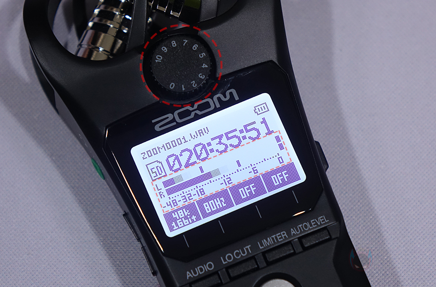 LCD 화면 아래에는 녹음 전 오디오 파일 설정을 할 수 있는데, WAV 파일로 44.1kHz/16비트, 48kHz/16비트, 48kHz/24비트, 96kHz/24비트로 저장할 수 있으며, MP3 파일로 48/128/192/256/320kbps로 저장할 수 있습니다. 그리고, 바로 옆에는 주변 소음을 감소시켜 주는 로우-컷(Low-cut) 버튼이 있는데, Off/80/120/160Hz 4단계로 조절할 수 있으며, 그 옆으로는 리미터 On/Off와 자동레벨 On/Off 버튼이 있죠. 자동레벨을 활성화시키면, LCD 위에 배치된 노브를 따로 조절 할 필요 없습니다. 설정이 끝나면, 바로 아래 녹음 버튼을 누르면 바로 녹음 모드가 시작되고, 옆에 LED 인디케이터도 레드(Red) 색상으로 점등되죠. 그리고, 녹음을 끝낼 때는 녹음 버튼을 다시 누르면 됩니다.