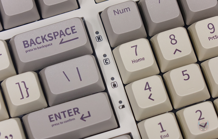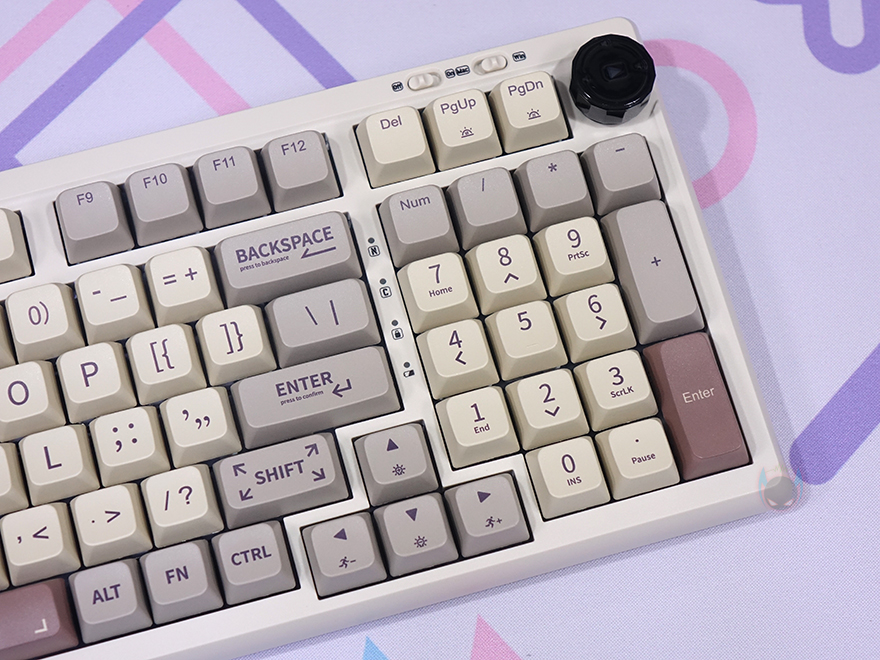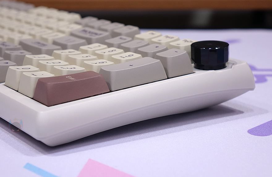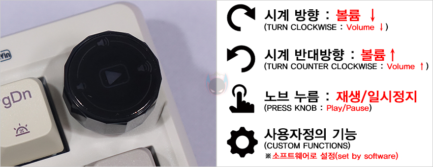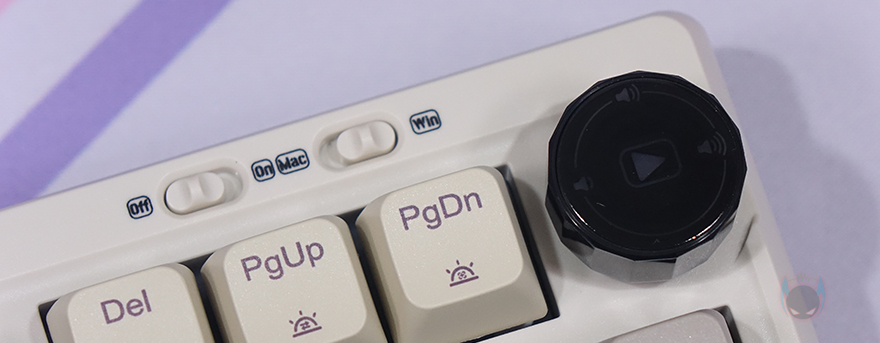 RT100 키보드를 좀 더 자세히 살펴보면, 90~99% 배열에 따른 제품들처럼 RT100 역시 맨 오른쪽에 키 배열이 그 특성을 보여주는데, 크기는 텐키리스와 비슷하지만 숫자키패드와 방향키, 그리고 일부 특수키를 배치하고 있습니다. 그리고, 엔터(Enter)키와 숫자키패드 사이에는 LED 인디케이터(Indicator)가 배치되어 있죠. 그리고, 외형적으로 가장 눈에 띄는 부분도 맨 오른쪽에 배치되어 있는데 바로, 노브(Knob)입니다. 노브에 표시된 아이콘들을 보면 쉽게 짐작할 수 있듯이 기본적으로 볼륨조절과 재생 컨트롤 기능을 하고 있습니다. 그리고, 뒤에서 다시 확인하겠지만, 소프트웨어도 제공되어 사용자가 지정해서 기능을 사용할 수도 있죠. 그리고, 노브 왼쪽 대각선 방향으로는 스위치가 배치되어 있는데, 무선 On/Off, 윈도우&맥(Mac) 레이아웃 스위치(Layout switch)입니다.