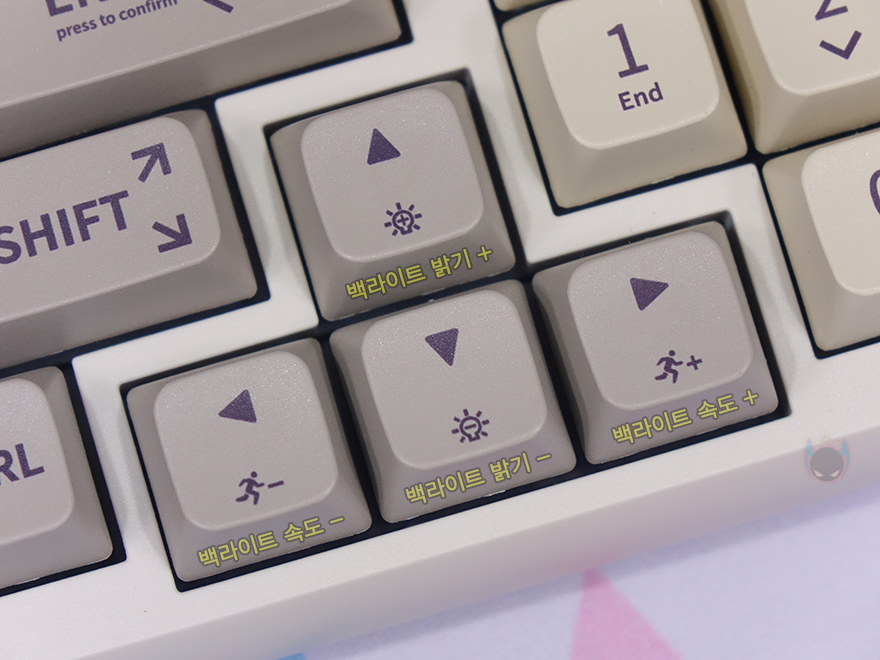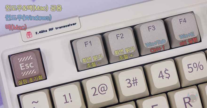 RT100 키보드 역시 Fn키 조합으로 부가기능들을 갖추고 있는데, 윈도우와 맥(Mac) 레이아웃 둘 다 지원하기 때문에 일부 기능은 다릅니다. 일단, ESC키는 공장초기화, F1~F2키는 화면밝기조절, F3키는 윈도우일때는 Win+Tab, 맥일 때는 Ctrl+↑ 기능이며, F4키 역시 윈도우일때는 Win+E, 맥일때는 시리 실행입니다. 그리고, F5~F6키는 윈도우만 사용되는데 각각 메일(Mail)과 브라우저 실행이죠. F7~F9키까지는 공용으로 재생컨트롤 기능입니다. 이외에도 블루투스와 무선 2.4GHz 연결 시 사용되는 키는 QWER이며, 백스페이스는 배터리 잔량, 윈도우키는 잠금/해제를 갖추고 있습니다. 그리고, RGB 백라이트 기능은 노브(Knob) 왼쪽에 배치된 특수키와 방향키로 조합하는데, 특수키 Delete는 모드 전환, PageUp/Down은 각각 단색 전환과 백라이트 On/Off 기능이 되겠고, 방향키는 상하(↑↓)는 밝기조절, 좌우(←→)는 속도조절이 되겠습니다.