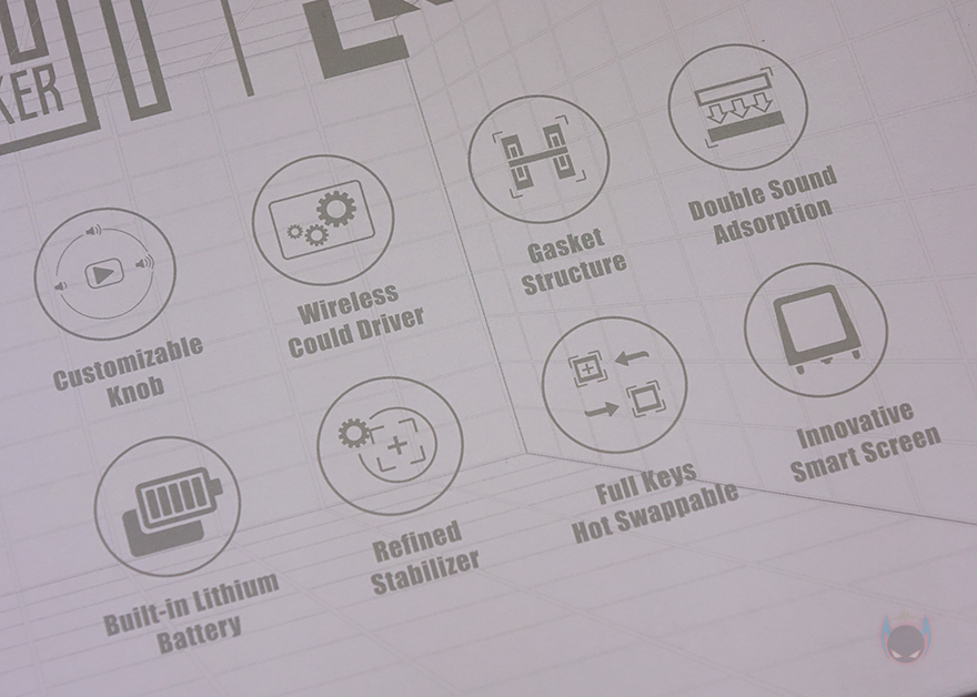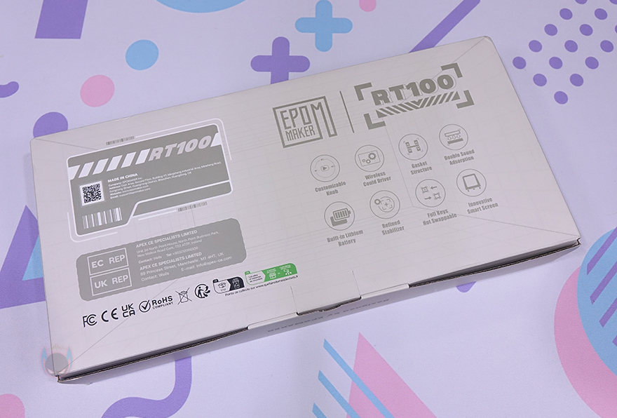 또한, 박스 후면에는 제품 주요 특징을 확인할 수 있는데, 사용자 지정 노브(Customizable Knob), 무선 드라이버(Wireless Could Driver), 내장배터리(Built-in Lithium Battery), 기본 윤활된 스테빌라이저(Refined Stabilizer), 가스켓 구조(Gasket Structure), 이중 흡음재(Double Sound Adsorption), 핫-스왑 스위치(Full Keys Hot Swappable), 스마트 스크린(Innovative Smart Screen)까지 8가지를 언급하고 있습니다. 그리고, EPOMAKER를 소개할 때마다 몇 번 강조했듯이, EPOMAKER가 다른 키보드 가게들과 차별되는 이유는 직접 디자인을 해서 자사 제품도 내놓는다라는 점으로, 이번 RT100도 EPOMAKER에서 디자인을 했죠.