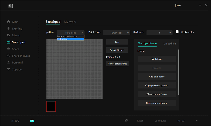 방금 프로그램에서 확인했듯이, RT100의 스마트 스크린(Smart screen)은 사용자가 직접 만들어서 적용할 수도 있고, 다른 사람들이 만들어놓은 이미지를 프로그램에서 공유해주고 있어서 가지고와 적용할수도 있습니다. 먼저, 사용자가 직접 만들어서 적용할 수 있는 스케치패드(Sketchpad)에서 색상, 브러시 크기를 설정해 직접 그린 이미지나 만들어놓은 이미지 파일을 불러와서 업로드해 적용할 수 있습니다. 또한, 이미지 업로드 아래에는 System Information 부분이 있는데, 이 부분도 업로드를 하면 연결된 PC의 온도와 CPU 사용율을 표시해 줍니다.