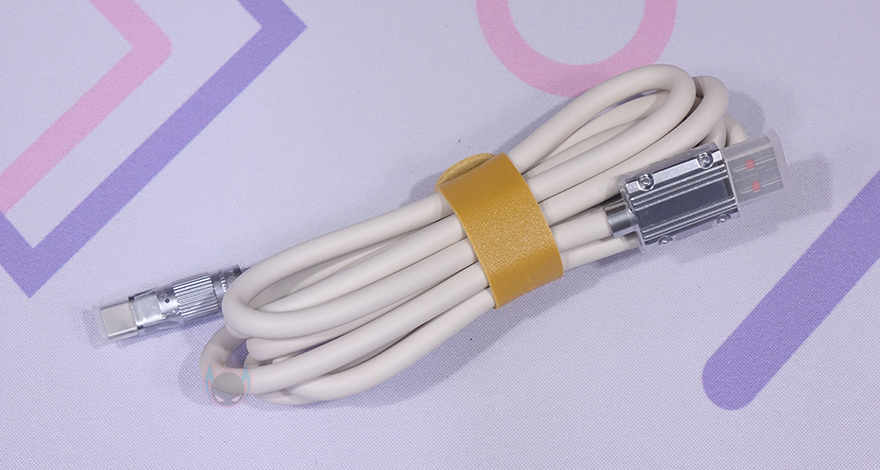 끝으로, RT100 키보드 밑바닥을 보면, 테두리 부근으로 반투명 패드를 부착해 미끄럼방지가 되도록 했으며, 앞부분에는 2단 높낮이조절 받침대가 적용되어 있습니다. 물론, 측면에서 보면 타이핑에 최적화인 스텝-스컬처 2 단계 배열을 갖추고 있죠. 또한, 유선시 사용되는 분리형 USB 전원 및 충전 케이블도 제품 콘셉트에 맞춰서 색상을 적용했고, 고급형 제품답게 케이블 굵기도 6mm대로 일반 키보드의 케이블보다 훨씬 굵습니다. 그리고, USB 인터페이스 부분도 메탈(Metal) 소재를 사용해 내구성을 높였고, 사용하지 않을 시 보호를 위해 덮개도 제공해주고 있죠. 총 길이는 1.8m입니다.