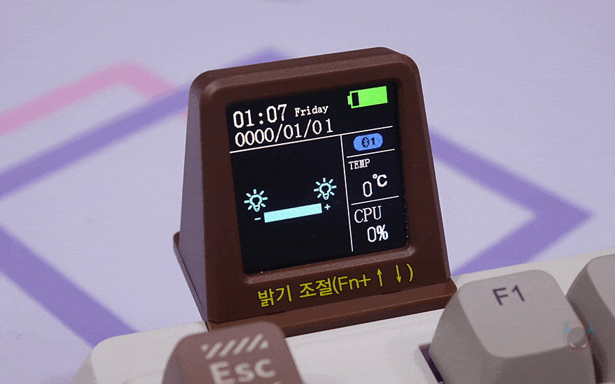 이번에는 RT100 키보드의 RGB 백라이트 효과를 확인해 보는데, Fn+Delete 키를 통해서 모드 전환은 총 18가지 모드로 할 수 있으며, PageUp키로는 RGB 컬러를 제외하고 단색 8가지로 변경할 수 있습니다. 그리고, 무선 사용 시 배터리 소모를 줄일 수 있도록 PageDown키로 On/Off 할 수 있고, 상하(↑↓) 방향키를 통해 밝기조절, 좌우(←→) 방향키로 모드 속도조절을 할 수 있죠. 모두 5단계로 조절됩니다. 그리고, 밝기조절, 속도조절, 백라이트 On/Off를 할 때는 스마트 스크린에도 작동 상태를 보여줍니다.
