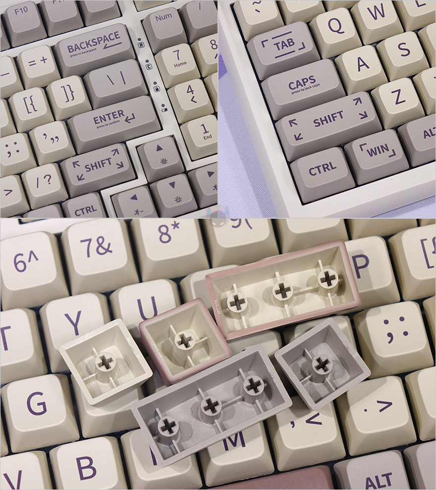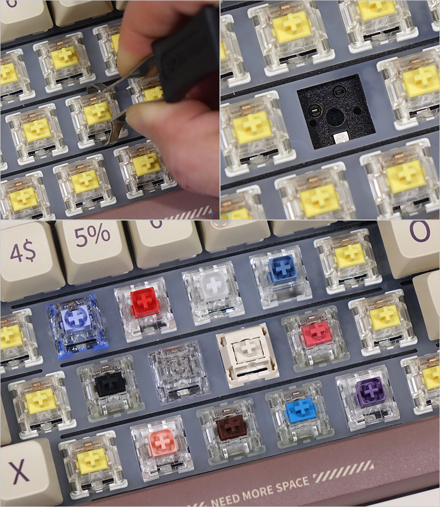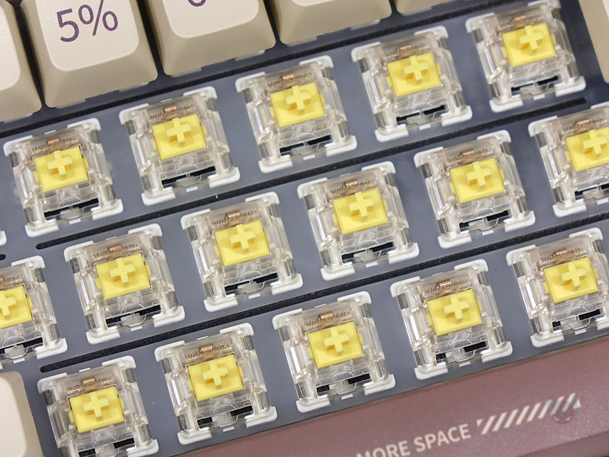 그리고, 레트로(Retro) 콘셉트에 맞춰서 키캡 역시 클래식한 색상을 적용하면서 동시에 폰트 표시도 심플하게 처리했습니다. 키캡 재질은 PBT 재질이고, 이중사출 방식이 아니지만 두께가 1.5mm 후반대로 이중사출방식만큼이나 두껍죠. 또한, 스위치 같은 경우에는 구매 시 총 4가지 스위치 중 소비자가 선택할 수 있는데, 3가지는 EPOMAKER의 커스텀 스위치이며, 나머지 1가지는 게이트론(Gateron)의 프로 황축(Pro Yellow)입니다. 물론, 스위치들은 모두 핫-스왑 방식으로 분리가 가능하고, 스위치를 분리하면 PCB 홈이 5개인 것을 확인할 수 있어서, 3pin과 5pin 모두 호환이 가능하죠. 또한, PCB에 탑재된 SMD LED도 일반적인 북향에 아닌 남향(South-Facing)으로 적용되어 있습니다. RT100처럼 투과되는 키캡이 아니라 키캡 사이들로 RGB 백라이트 효과를 극대화할 때는 LED가 남향에 적용되는 게 더 효과적입니다.