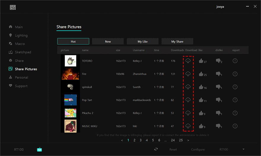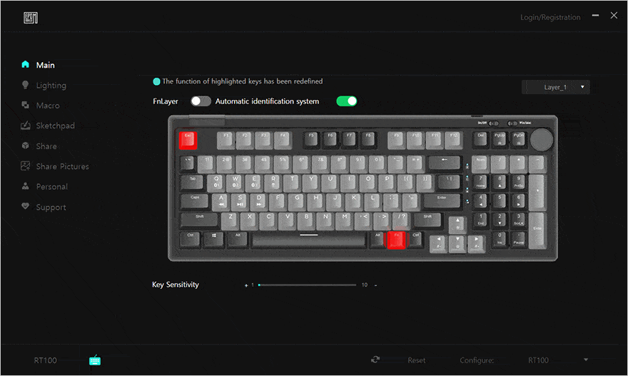 RT100 키보드 역시 EPOMAKER의 공용 소프트웨어를 지원하고 있습니다. 그래서, 프로그램을 실행하면, RT100 인식과 함께 메인(Main) 화면에 키보드 이미지를 보여주며, 3개의 프로파일 지원을 비롯, 10단계 키 감도조절, 키 기능 변경을 할 수 있는데, 키조합, 매크로, 미디어, 마우스 기능으로 변경할 수 있죠. 물론, 앞서 언급한 노브(Knob)의 눌렀을 때 기능도 추가로 설정할 수 있습니다. 또한, FnLayer를 활성화시키면 레드(Red) 색상의 키들은 변경할 수 없고, Lighting 설정에선 RGB 백라이트 설정으로 앞서 확인한 18가지 모드 외에 추가로 음악(Music) 모드를 설정할 수 있으며, 모드 방향 설정도 가능합니다. 이외에 매크로, 스마트 스크린에 사용자가 직접 이미지를 적용할 수 있는 스케치패드(Sketchpad), 매크로 공유(Share), 이미지 공유(Share Pictures), 사용자의 키보드 연결목록 관리, 프로그램 업데이트 및 키보드 펌웨어 기능도 갖추고 있죠. 참고로, 키보드 펌웨어는 다른 키보드들과 마찬가지로 유선 연결상태에서만 가능합니다.