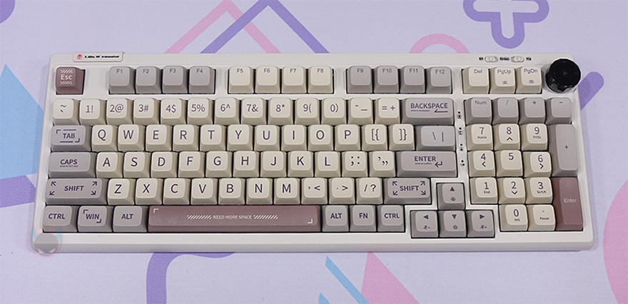 그럼, 본격적으로 EPOMAKER RT100 기계식 키보드를 살펴봐야겠죠. 앞서 제품박스처럼 키보드 역시 한눈에 봐도 레트로(Retro) 감성의 디자인이라는 걸 느낄 수 있습니다. 키보드 케이스의 색상이라든지 키캡의 색상이 그 감성을 느낄 수 있게 해주고 있죠. 총 키수는 97 키(keys)로 최근 기계식 키보드에 많이 보게 되는 90~99% 배열입니다. 그리고, 무게는 약 984g을 가졌는데, 앞서 주요 특징에서 확인했듯이 가스켓(Gasket) 구조와 이중 흡음재(Double Sound Adsorption)를 갖추고 있기 때문에 풀-배열은 아니지만 무게감이 있죠. 또한, 키보드 측면도 단순한 디자인이 아니라 인체공학적(Ergonomic)으로 적용했습니다.