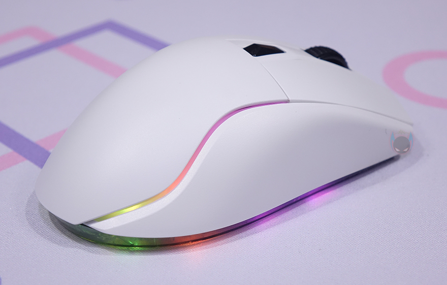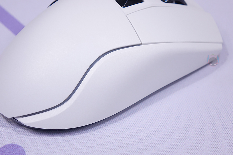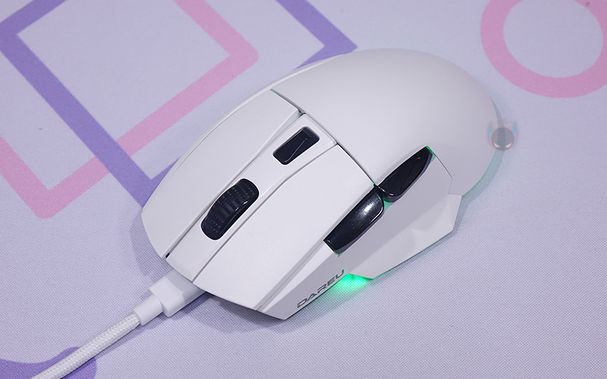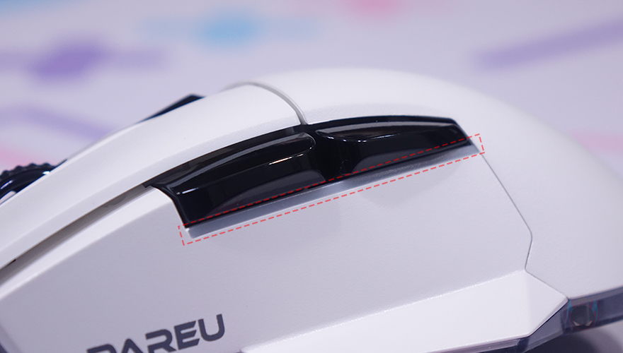그래도, A950에서 보여줬던 다얼유의 핵심적인 특징은 A955에서도 그대로 유지되고 있습니다. 일단, 기본 좌우버튼은 A950과 마찬가지로 A955도 분리설계를 적용해 그립 종류에 상관없이 클릭이 잘 유도 되도록했으며, 균일한 클릭감을 가지기 위해 KSB 2.0 기술도 그대로 적용되었죠. 그리고, 마우스 전체적으로 무광으로 처리했는데, 휠-버튼 부분의 가운데 라인은 유일하게 유광으로 처리했습니다. 휠-버튼은 접지력과 정확한 스크롤을 위해 돌기 디자인에 고무재질을 적용했으며, 바로 뒤에는 DPI 버튼이 배치되어 있는데 화이트와 대비되는 블랙 색상으로 역시 유광으로 처리했습니다. 그리고, 전면에서 보면 기울임을 통해 전형적인 오른손 전용 마우스라는 걸 다시 확인할 수 있으며, 아래에 제공되는 분리형 USB 케이블과 연결되는 USB Type-C 포트가 배치되어 있죠.