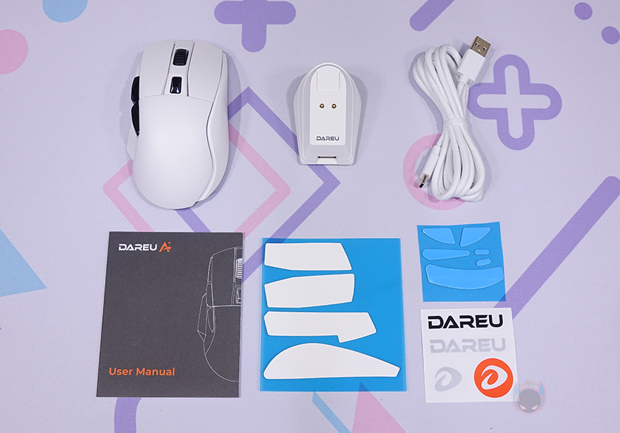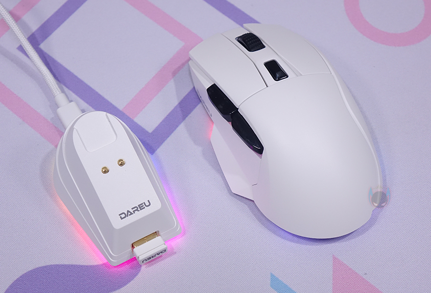 끝으로, 충전독은 앞서 언급한 대로 기존의 자사 제품들에 사용되는 충전독과 동일한 제품으로 충전독 바닥 테두리 라인으로 LED 백라이트 효과를 볼 수 있게 해 놨으며, 바닥에 모드 전환 버튼도 적용되어 있습니다. 그리고, 충전독 또는 마우스에 연결해서 사용할 수 있는 분리형 USB 케이블 역시 A950에 제공되는 케이블과 동일한 케이블로 총 1.5m 길이에 꼬임방지를 위한 전체 슬리빙처리, 신호손실 최소화를 위한 노이즈필터가 적용되어 있으며, 연결인터페이스는 USB Type-C to A입니다.