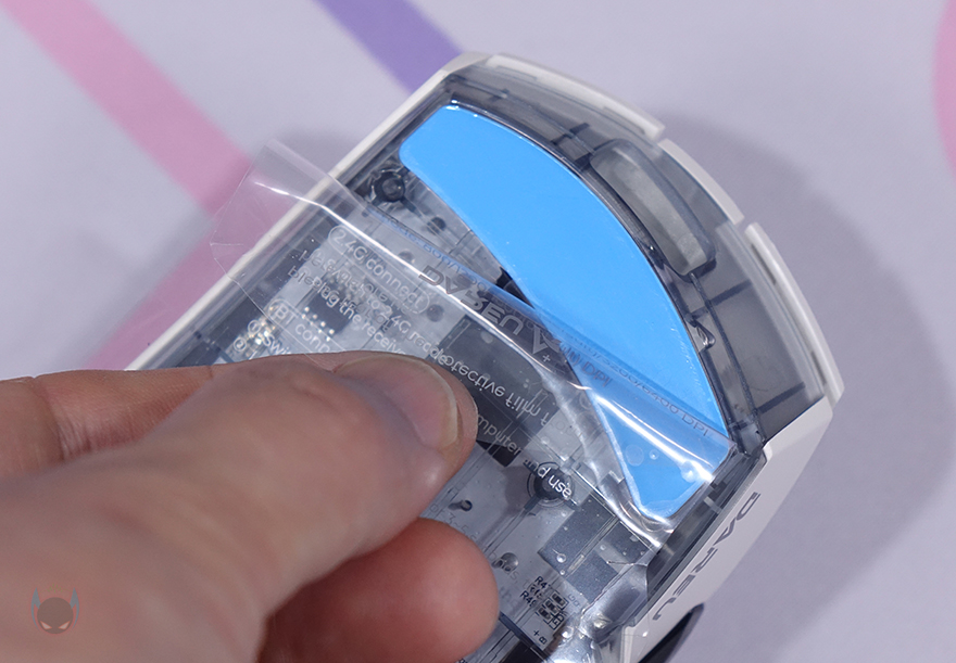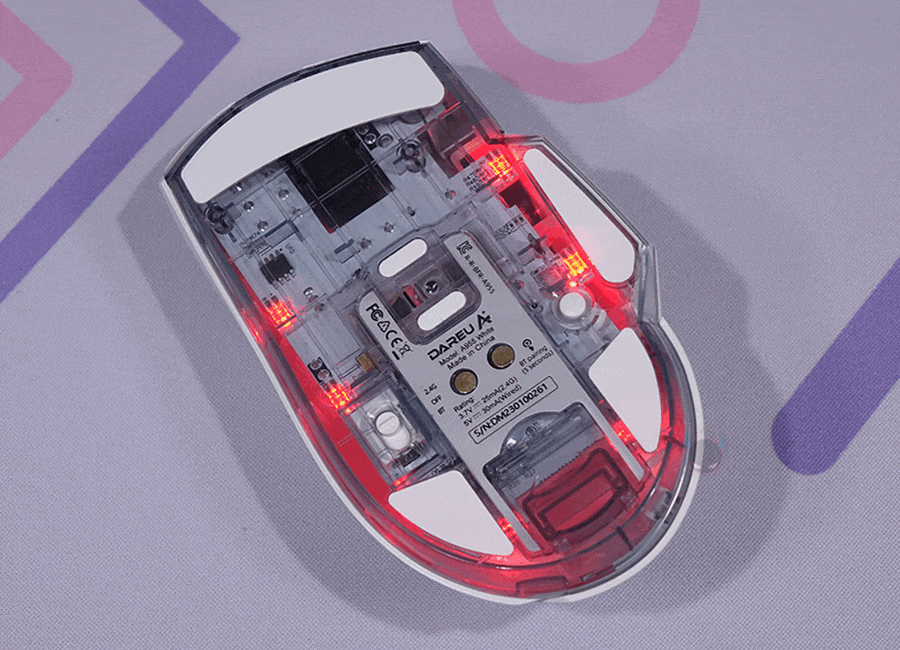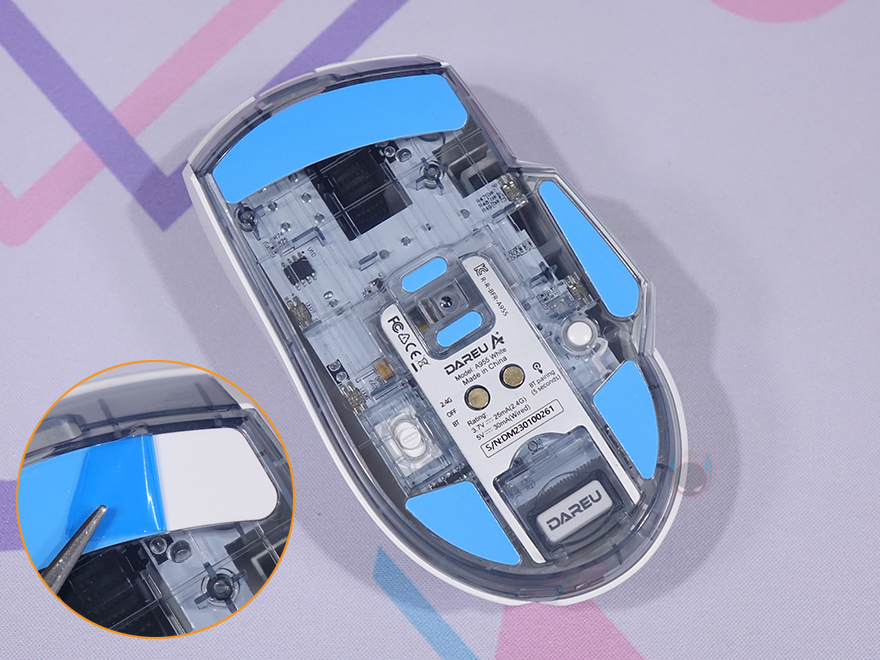 A955 마우스 밑바닥 부분에는 A950 보다 1개 더 많은 총 6개의 테프론 피트를 부착하고 있으며, 개봉 시에는 보호비닐이 부착되어 있기 때문에 제거를 해야 하고, 제거를 하면 테프론 피트 역시 제품 색상에 맞춰서 적용했는 걸 확인할 수 있습니다. 그리고, 이 제품의 외형적인 부분에서 가장 큰 특징이 바로 밑바닥 부분으로 바닥 소재를 투명 클리어로 처리했습니다. 그래서, 내부에 장착된 PCB 기판이나 일부 칩들을 그대로 볼 수 있죠. 최근 기계식 키보드에 새로운 트렌드 중 하나인 클리어 디자인을 마우스에도 그대로 적용한 거라 할 수 있습니다.