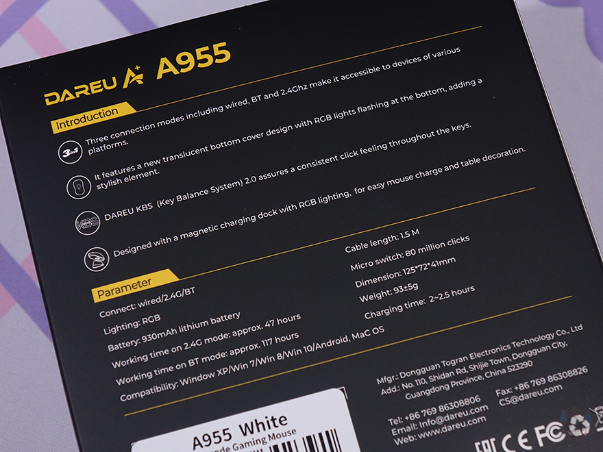 그리고, 박스 한쪽 측면에는 무선과 충전독 연결방식을 A950과 동일한 그림으로 담고 있는데, A950 모델을 사용했던 사용자라면 이 이미지만봐도 충전독이 호환되겠구나 생각할 수 있죠. 그리고, 아래에는 마우스 센서에 대한 표기를 상세하고 있는데, A950과 마찬가지로 A955에서도 다얼유와 Pixart 공동개발의 AIM-WL 광센서가 사용되었습니다. 그리고, 박스 후면에는 제품 소개와 제품의 전체적인 기본 사양을 담고 있죠.