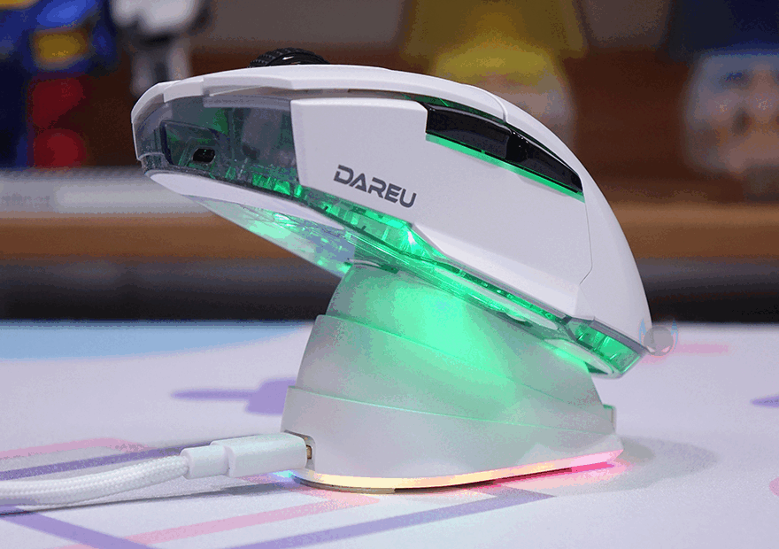 그리고, A955 마우스 연결이 되면 바로 왼쪽 측면 버튼 아래와 오른쪽 측면 경계 부분, 마우스 밑바닥에서 LED 백라이트 효과를 볼 수 있습니다. 물론, 소프트웨어를 제공하기 때문에 프로그램에서 다양한 모드 효과를 설정해서 볼 수 있으며, 충전독에 올려놓았을 때는 충전상태로 단색으로 보여줍니다. 참고로 충전중일 때는 녹색, 완충이 되면 핑크색입니다. 그리고, 밝은 곳보다는 어두운 곳일수록 좀 더 시각적인 효과가 큽니다. 또한, 충전독 같은 경우에는 앞선 A950, EM901X의 충전독과 마찬가지로 충전독에 있는 RGB 버튼으로 충전독의 LED 백라이트 모드 효과를 전환해서 볼 수 있습니다. 참고로, DPI 버튼 역시 최대 5단계로 조절이 되는데, LED 색상으로 단계 구분해 줍니다.