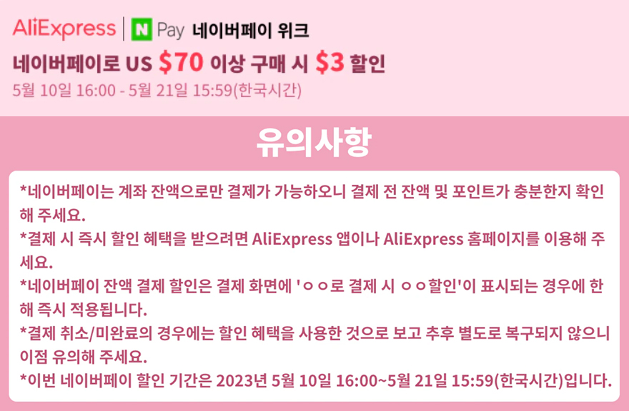 먼저, 이번 감사합니다 Day 프로모션때 결제할인을 받을 수 있는 결제사는 네이버페이로 70달러이상 구매시 3달러 할인을 해준다. 할인 가격대 기준이나 할인폭도 지난 달보다는 낮다. 참고로, 네이버페이 결제할인은 감사합니다 Day가 끝나도 그 다음 주 할인 프로모션까지 적용이 된다. 그리고, 결제할인과 중복으로 적용할 수 있는 할인 코드는 아래와 같으며, 무료배송과 5~7일안에 배송해주는 꽁돈대첩 전용 상품을 위한 전용 할인코드는 6월 1일까지 사용할 수 있다.