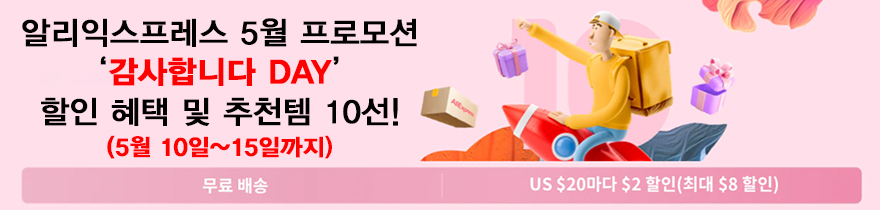 국내 소비자들도 직구로 많이 이용하고 있는 글로벌 쇼핑몰 '알리익스프레스'가 5월 프로모션 할인행사 '감사합니다 Day'를 한국시간으로 5월 10일부터 15일까지 5일간 진행한다. 이번 5월 프로모션 규모 역시 4월과 비슷한 규모로 큰 행사는 아니지만, 100달러 미만에선 충분히 저렴하게 평소보다 할인된 가격으로 구입할 수 있는 행사이다. 이번 5월 프로모션 역시 결제 할인과 할인코드가 제공되면, 한국 소비자들을 위한 전용 카테고리 꽁돈대첩의 할인코드도 제공된다. 또한, 구입가격이 20달러이상이면 최대 8달러 할인을 해준다.