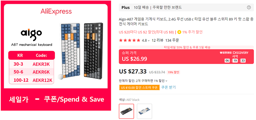 올해 알리익스프레스에서 가장 핫한 키보드로 떠오른 브랜드라면 단연 Aigo다. 물론, Aigo가 키보드 전문업체는 아니지만, A100 키보드를 좋은 품질에 저렴한 가격으로 내놓으면서 큰 인기를 받았다. 그리고, 그 이후로 풀-배열의 A108도 출시했고, 이번에 텐키리스 버전의 A87도 출시를 했다. 상품페이지에는 할인코드가 나오지만, 이번 프로모션 행사에선 이보다 저렴하게 나왔기때문에, 자동할인 외에는 적용되지 않는다. 텐키리스 키보드를 유무선으로 저렴하게 구입하고 싶다면 챙기자!