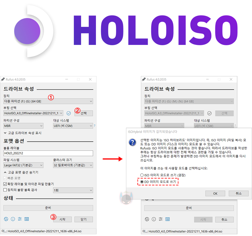 끝으로, 방금 확인했듯이 비너스(Venus) UM773 Lite 미니 PC의 CPU와 내장 그래픽은 미니 PC의 최대 단점이라 할 수 있는 게임성능에서도 나름 만족스러운 결과를 보여줍니다. 특히, 내장 그래픽 Radeon 680M은 AMD 기판의 콘솔기기 스팀 덱(Steam Deck)에 내장 그래픽보다 상위 성능을 자랑하죠. 그래서, 스팀 덱처럼 AMD 기반의 미니 PC를 최근 콘솔기기로 사용하는 경우가 늘어나고 있는데, UM773 Lite 역시 스팀 콘솔(Steam Console)로 사용할 수 있습니다. 일단, 스팀 OS 기반의 HOLOISO를 설치해줘야 하는데, HOLOISO 홈페이지에서 가장 최신 버전을 다운로드한 후, Rufus 유틸리티를 통해 HOLOISO를 부팅 USB로 담습니다.