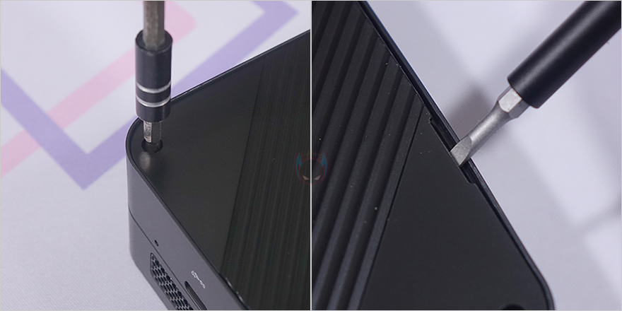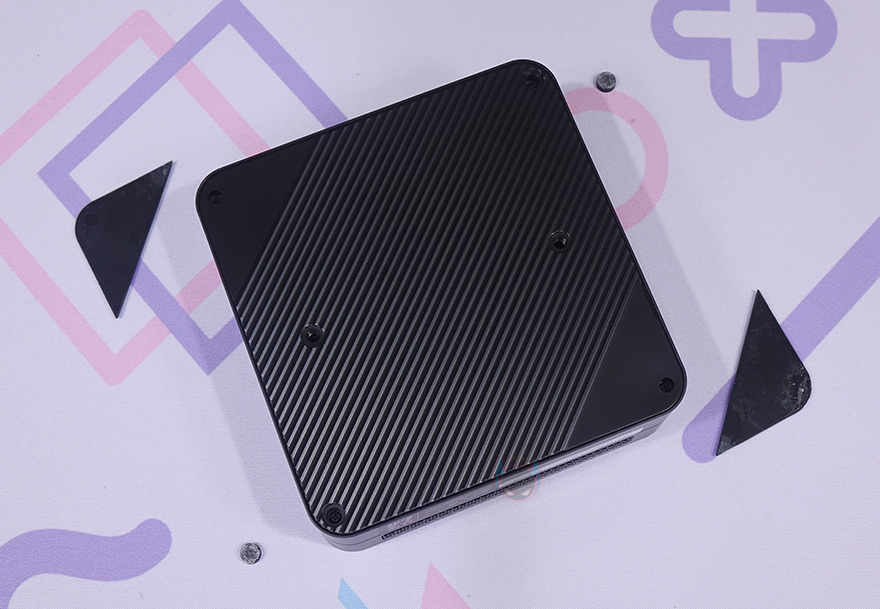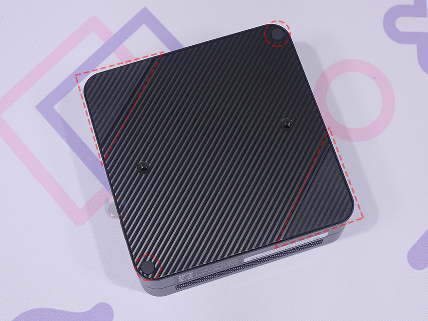 본체 후면에는 윗부분에 에어홀 처리와 함께 왼쪽에 켄싱턴 락(Kensington lock)이 적용되어 있으며, 아래에는 전원 어댑터 연결 포트를 비롯해 2.5Gb 랜(LAN), USB 3.2 Gen2 Type-A, HDMI 2개, USB 2.0 Type-A 포트가 배치되어 있습니다. 그리고, 본체 바닥부분 역시 상단과 동일하게 사선 방향으로 홈 처리를 해놨는데, 대각선 방향으로 각각 서로 다른 2쌍의 미끄럼방지 고무 패드가 부착되어 있습니다. 이 패드를 떼어내면, 고정 나사를 확인할 수 있는데, 나사를 모두 풀면 쉽게 바닥 커버를 분리할 수 있죠.
