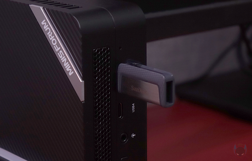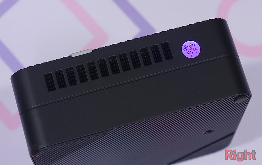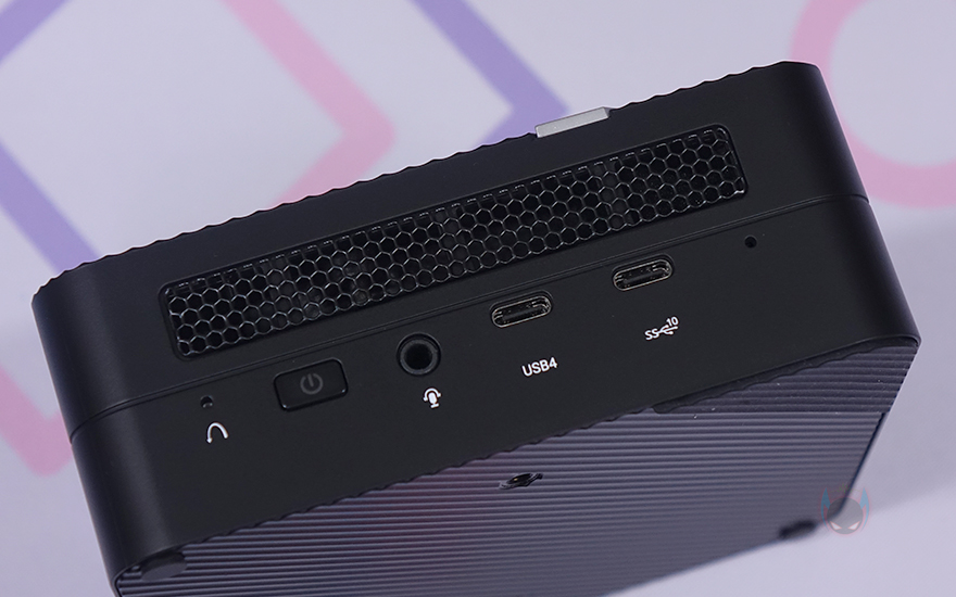 좀 더 자세히 살펴보면, 본체 상단(Top)은 사선 방향으로 일정 간격 홈 처리를 하면서 오른쪽 앞부분에 로고(Logo) 표시를 해놨죠. 포인트를 주는 디자인이라 할 수 있습니다. 그리고, 전면(Front)에는 가운데 홈-라인을 기준으로 윗부분에는 내부 발열 배출과 쿨링 효과를 위해 메쉬(Mesh) 디자인이 적용되었으며, 아래에는 버튼 및 포트가 배치되어 있는데, 왼쪽부터 CMOS 클리어(Clear), 전원(Power), 3.5mm 콤보-잭(Come jack), USB4 Type-C, USB 3.2 Gen2 Type-C 포트순으로 위치하고 있죠. 그리고, 전면 기준 왼쪽(Left) 측면에도 메쉬 디자인을 적용하고 있으며, 오른쪽(Right) 측면에는 에어홀 처리를 해놨습니다.