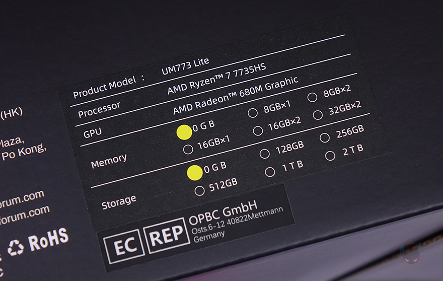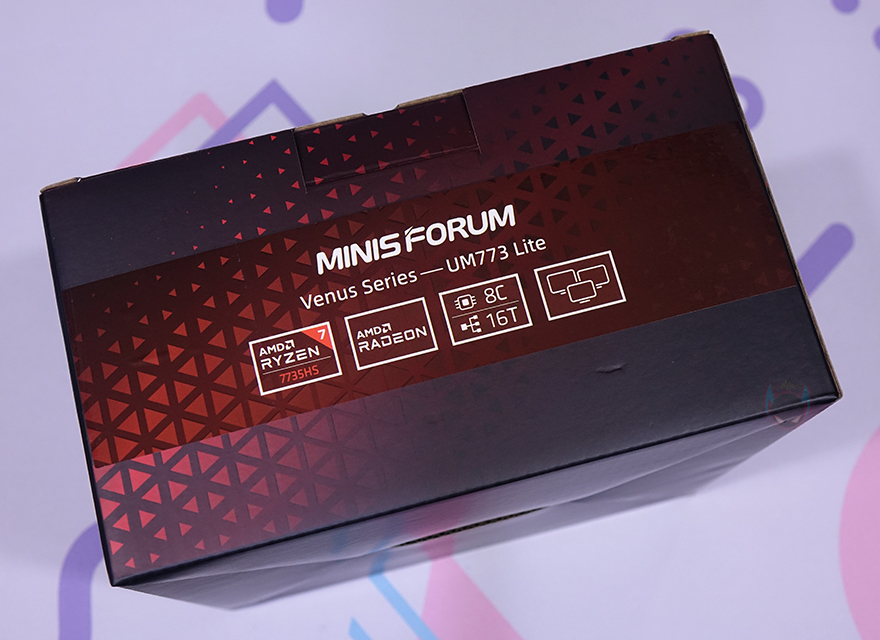 제품 패키지는 다른 미니 PC 제품들처럼 박스형태로 박스 전체가 밀봉처리가 되어있어서 소비자입장에선 판매 제품에 신뢰를 가질 수 있습니다. 그리고, 박스 상단에는 제품 옵션 표기를 확인할 수 있는데, 비너스(Venus) UM773 Lite 같은경우엔 No RAM, No Storage 옵션부터 구매가 가능하죠. 물론, 전원 플러그 규격도 한국과 호환되는 유럽형(EU)으로 선택할 수 있습니다. 또한, 박스 한쪽 측면과 후면에는 CPU에 대한 간략한 표기를 확인할 수 있는데, 시작에서 언급했듯이 UM773 Lite에는 AMD Ryzen 7 7735HS CPU가 탑재되어 있습니다. 8 코어(Core)/16 스레드(Thread) 구조에 내장그래픽은 라데온(Radeon) 680M이 탑재되었습니다. 뒤에서 확인하겠지만, UM773 Lite가 인기 있는 이유 중 하나는 바로 내장그래픽입니다.