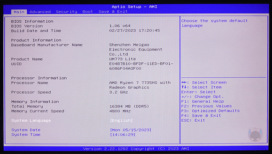 직접, Minisforum UM773 Lite 미니 PC(mini PC)를 사용해 보면, 먼저 CMOS 메뉴를 잠깐 살펴보는데, 바이오스(Bios)는 AMI 바이오스로 예전 데스크톱 PC 구형 메인보드에서 많이 볼 수 있었던 인터페이스입니다. 메뉴는 메인(Main), 고급(Advanced), 보안(Security), 부팅(Boot), 저장&종료(Save&Exit)로 구성되어 있습니다. 참고로, UM773 Lite를 구매해서 운영체제(OS)를 설치한 후 최신 드라이버(Driver) 설치를 할 때는 Minisforum 홈페이지(https://www.minisforum.com/front/support/68/UM773)에서 제공하는 드라이버 설치파일을 사용하면 됩니다.