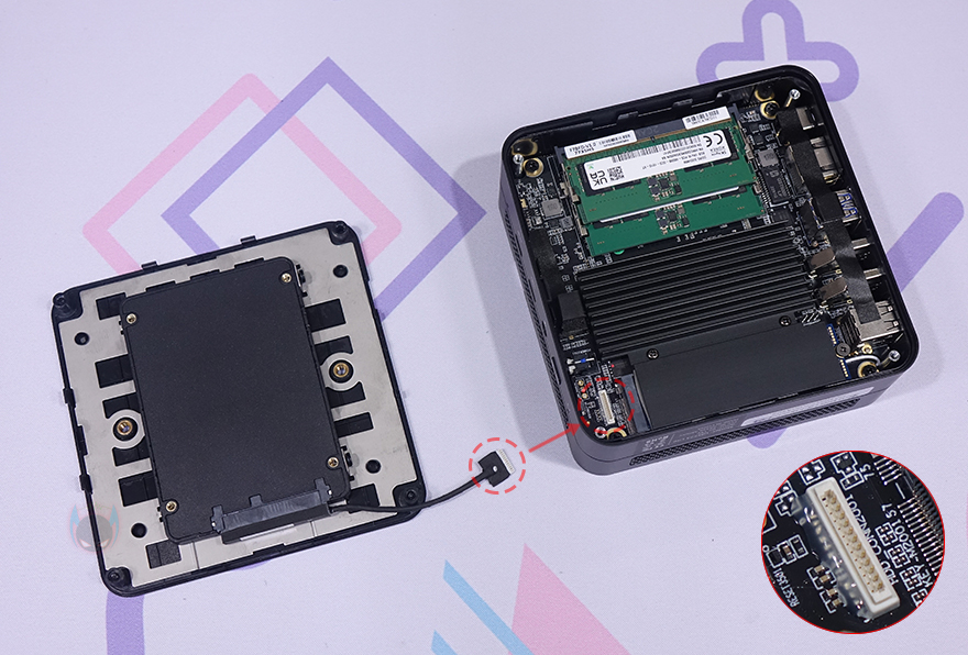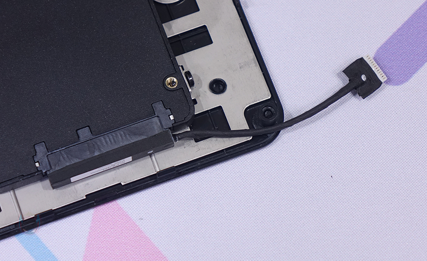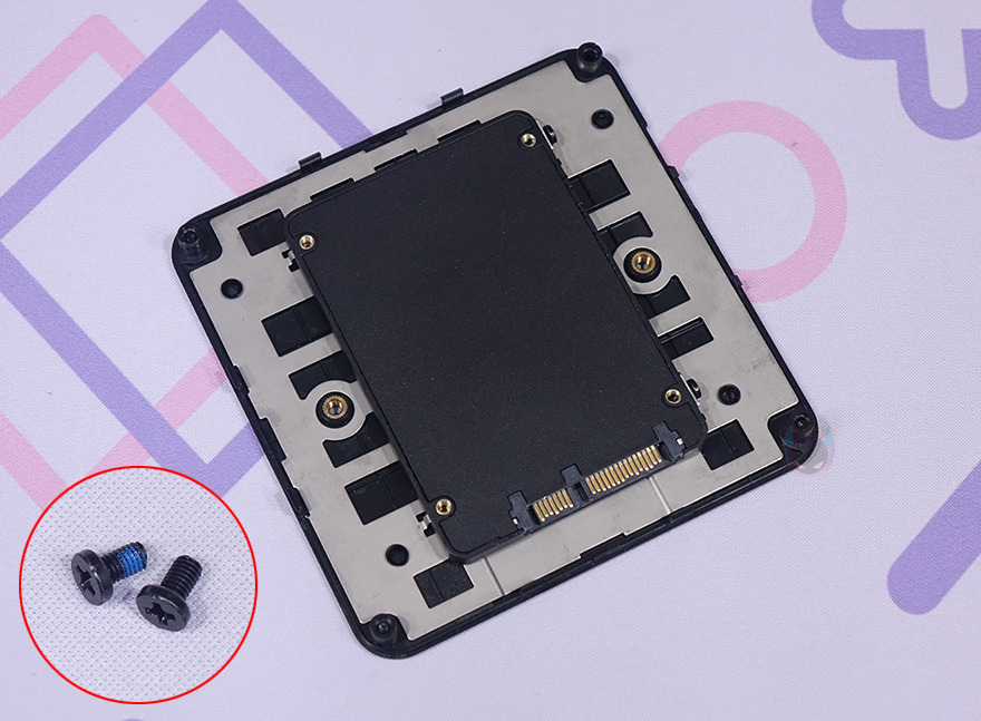 내부를 잠깐 살펴보기 전에 분리된 바닥 커버 안쪽에는 2.5인치 HDD/SSD를 1개 장착할 수 있게 지원해주고 있습니다. 한쪽은 걸쇠 방식이고 나머지 한쪽은 제공되는 나사로 고정해주면 되죠. 그리고, 2.5인치 HDD/SSD를 메인보드에 연결할 때는 제공되는 전용 SATA 케이블(Cable)을 사용해서, M.2 SSD 슬롯 왼쪽에 배치된 커넥터 부분에 연결하면 됩니다.