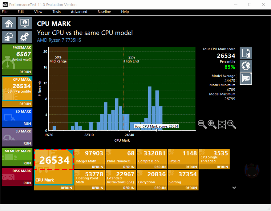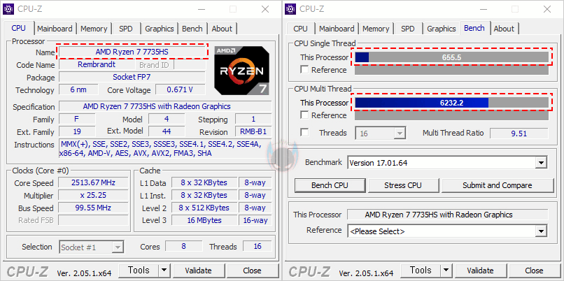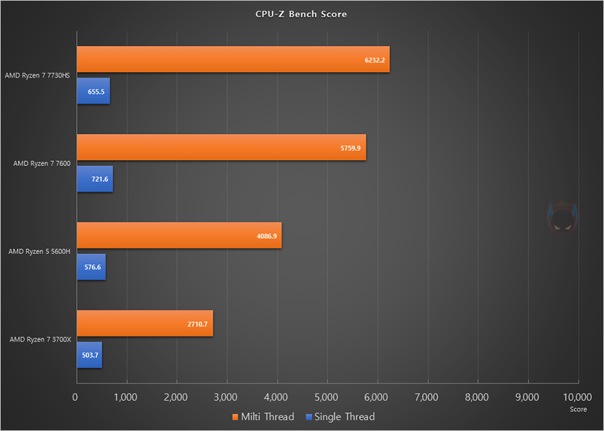 앞서 언급했듯이 UM773 Lite 미니 PC에는 AMD Ryzen 7 7735HS CPU가 탑재되어 있습니다. Ryzen 7 7735HS는 Zen4 기반의 가장 최신 APU CPU이기도 하죠. 코어(Core)는 8개, 스레드(Thread)는 16개 구성입니다. 그래서, 먼저 CPU의 성능을 확인해 보는데, AMD의 이전 세대와 현재 데스크톱 PC에 사용되는 7000 시리즈 CPU까지 함께 비교를 해 본 결과, Ryzen 7 7735HS의 성능 데스크탑 PC CPU은 Ryzen 5 7600과 비슷한 수준을 보여줍니다. CPU-Z Bench에선 오히려 앞서는 결과도 보여주죠. APU CPU지만, 데스크탑 PC CPU 부럽지 않게 고성능을 자랑합니다.