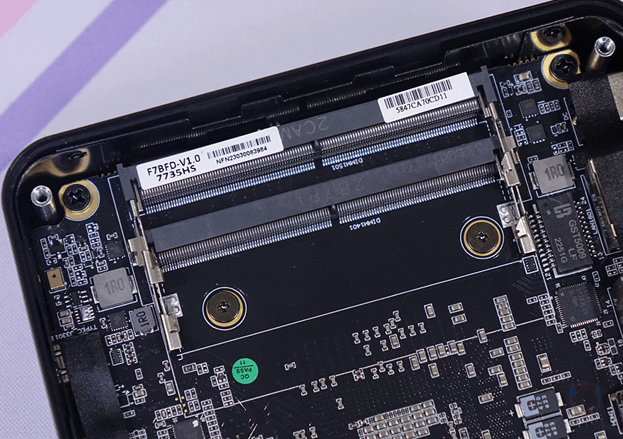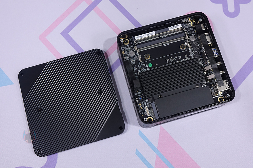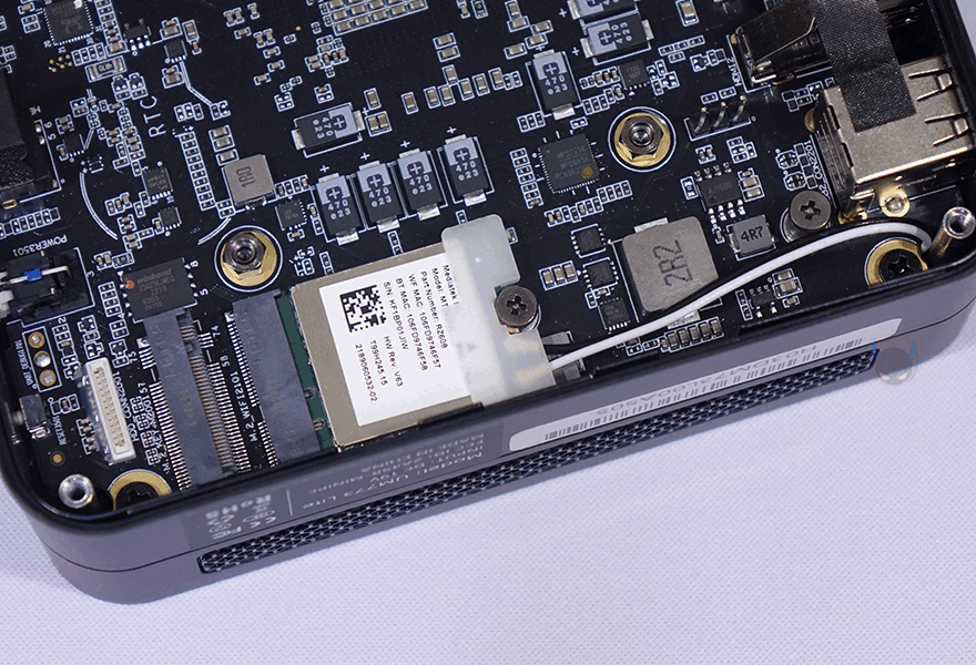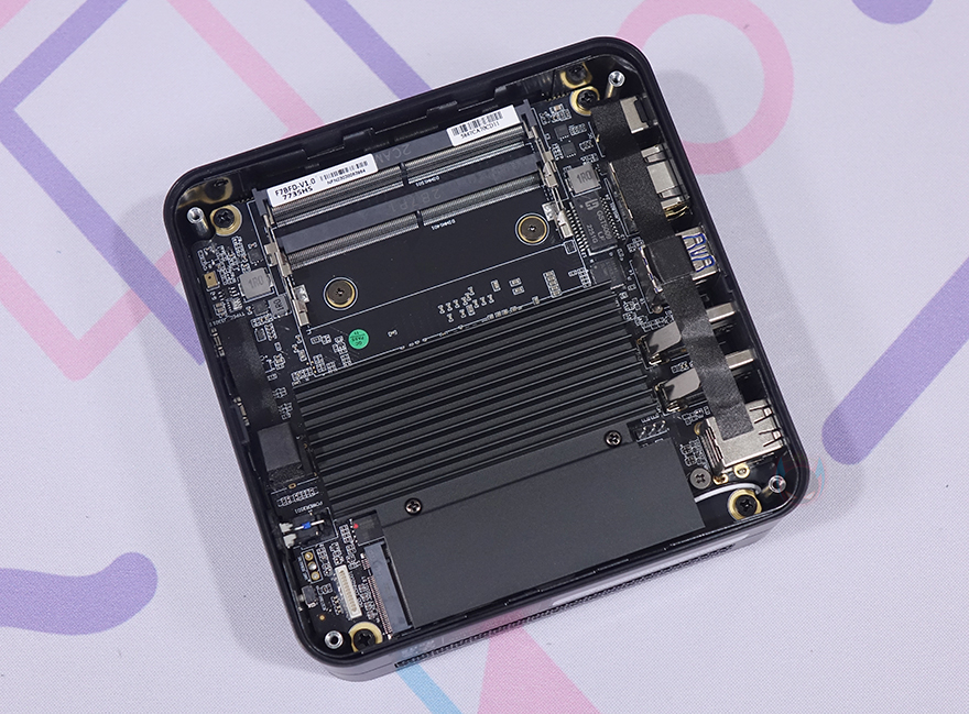 내부를 살펴보면, 앞에서 언급했듯이 UM773 Lite는 No RAM, No Storage 옵션부터 구매할 수 있습니다. 그러니깐 RAM과 저장장치(Storage)를 사용자가 따로 구매해서 장착 사용할 수 있다는 거죠. 그래서, 내부를 보면 메인보드 윗부분에는 SODIMM DDR5 RAM 2개를 장착할 수 있게 슬롯을 갖추고 있으며, 아래에는 큼지막한 히트싱크(Heatsink)가 장착되어 있는데, 중간에 나사 2개를 풀면 쉽게 분리가 되고 아랫부분에 WiFi/BT 모듈 장착 위에 2280 사이즈의 M.2 SSD를 장착할 수 있게 지원하고 있습니다. 물론, 히트싱크 안쪽에는 M.2 SSD 발열을 해결할 수 있게 써멀패드(Thermal Pad)가 부착되어 있죠. 참고로, M.2 SSD는 PCIe 4.0 규격까지 지원합니다.